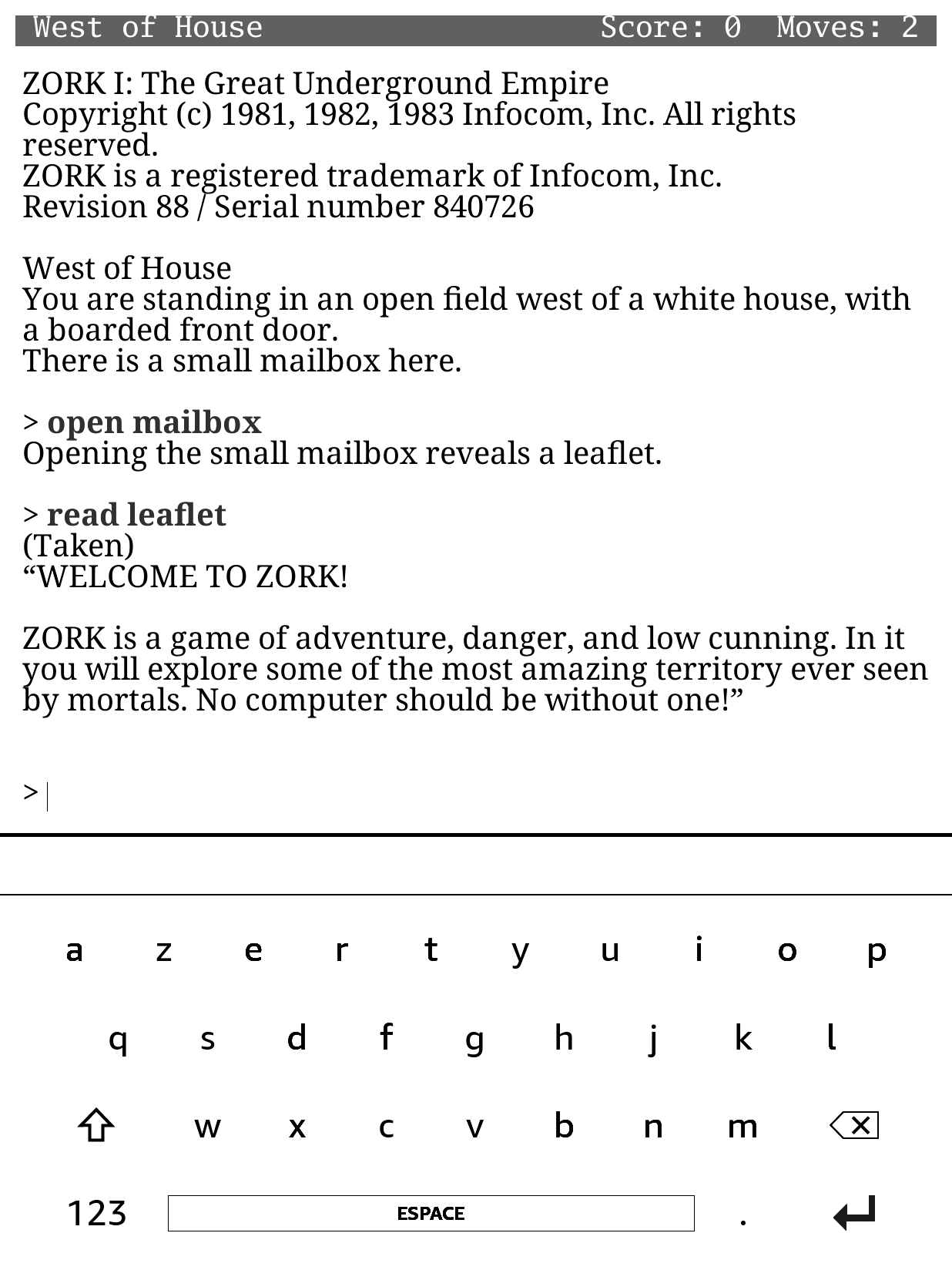 [ zork.dat ] terp frotz Concerning the disappearing keyboard, I also observed the issue (it's even worse on leafpad, another project I'm working on). Correcting this bug is my top priority. Adding a swipe gesture to display hidden keyboard is also a good suggestion. |
