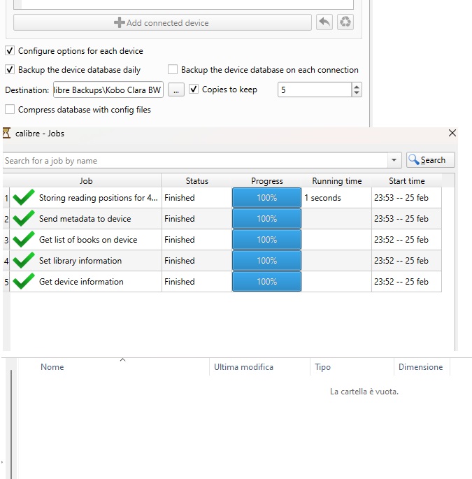 Yesterday I Backed up 8054 reading status on one Kobo (in one go) and wrote them to a second Kobo. I actually copied 8038 ebooks to the second Kobo first in one go as an experiment rather than usual few 100 at a time (which took about 200 minutes) and then waited for those to import after eject (which took a while) and then reconnected, which updated series etc. Then I restored the reading positions of the 8038 selected titles. All worked. Simply trying to copy files inc the database dierect between two Sage ereaders caused a "critical error" and the fresh Kobo Sage reset and erased everything. The Kobo database backup worked for both Sage ereaders yesterday. Everything seems upto date (Calibre, Kobo Driver, Kobo Utilities etc) I don't use kepub on Send, though I might have one or two for testing. I suppose I should delete older database backups occasionally. |