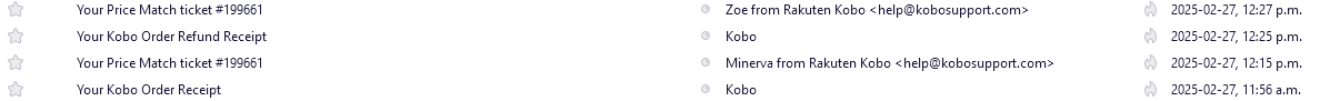 As a recent example of price matching, I purchased an ebook at Kobo CA that was $23.99 while at Amazon CA, it was $19.99. As soon as I completed the purchase, I requested a price match which is the difference between the prices plus 10% of the competitors price so $4 + $2 which means the book ended up costing me $17.99. It took less than a hour from when I received the email receipt to when my refund was finalized.