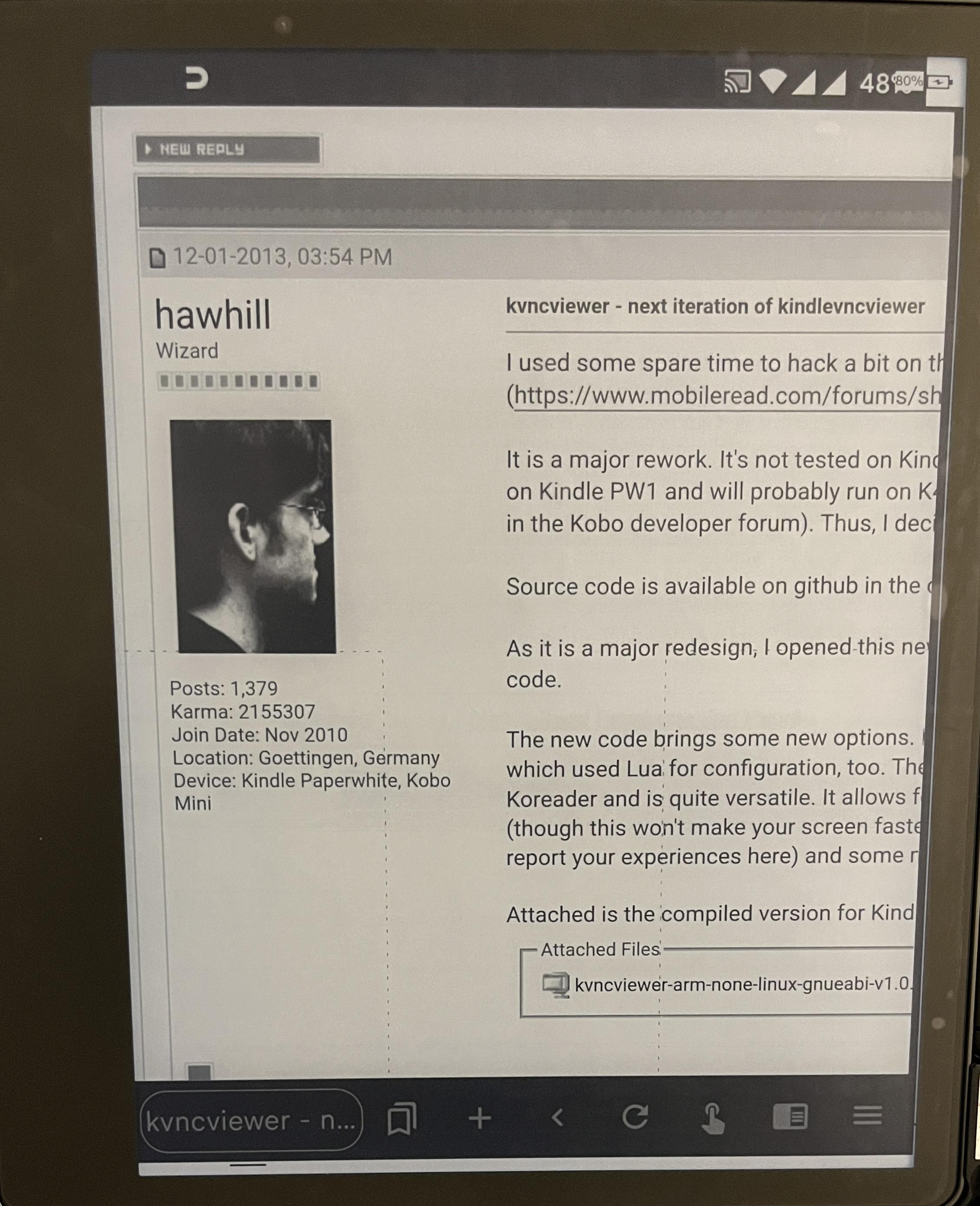 Changes in the attachment: 1. Recent bug fix from Github(key-event) bleeding, fixes an issue where VNC touch events were getting propagated to kindle gui 2. couple of fixes from older responses in this thread, missing constants 3. recent fixes for newer versions of PW, to refresh the screen in an infinite loop 4. Working touch control Usage: 1. Adjusting the screen resolution of android phone(will be acting as VNC server) to match the Kindle resolution Log into Android shell using adb connect & use the below command: There are some applications available in play store, to adjust mobile screen resolution with out using adb tools on laptop.wm size 1836x2448 :Kindle Scribe Resolution(need to be adjusted as per kindle model) wm size reset :Should be executed, when mobile phone should be reset to it's original resolution 2. I am starting VNC server on my mobile with application https://github.com/bk138/droidVNC-NG 3. Now I have a VNC server, which is providing the content in the resolution of kindle. Replace the IP address and Port from your VNC server(android) in the file: kvncviewer.sh ./luajit vncviewer.lua 192.168.23.12:5900 4. If any password is set in the VNC server, provide the same in the file:vncviewer.lua. Replace nil with "<yourpassword>" (including the quotes)5. Lauch the vnc viewer from KUAL How to exit from vnc viewer: Option 1: Force Restarting the kindle(easiest option). Even when the VNC server is stopped on mobile, it is recommended to restart the kindle immediately, after using it as VNC viewer Option 2: If you can do SSH into kindle, find out the parent PID of the kvncviewer.sh process from htop and kill the same using pkill -P $parent_pid Screenshot: Viewer: kvncviewer.zip I would like to thank all the developers(creators) for their contributions and making our devices more productive. Disclaimer: I am not responsible for any damage to the kindles. I just colated the files from different sources and wanted to share a working version(giving back to community). Setting up vnc viewer requires USB Networking(Wifi mode) working for this use case. If you want to use this application, be ready to be patient(time it takes to get it work for Newbie, is high) and doing your research. |
