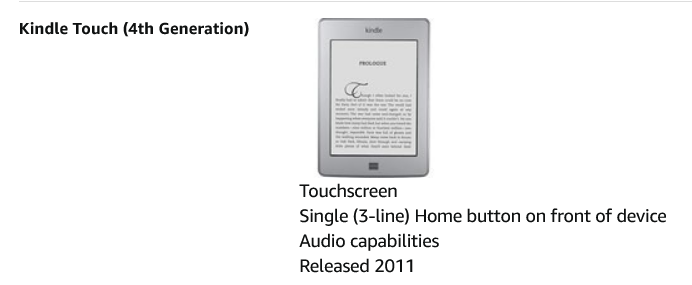 ![]() ETA: I checked the MobileRead Wiki, and was surprised to see this Kindle called the Kindle 5: https://wiki.mobileread.com/wiki/Kindle_5. So both Amazon and the MobileRead Wiki consider the 2012 black non-touch Kindle to be a 5 rather than 4. Now I'm wondering where "K4BNT" originated. Maybe I'll go back to calling it the K5
