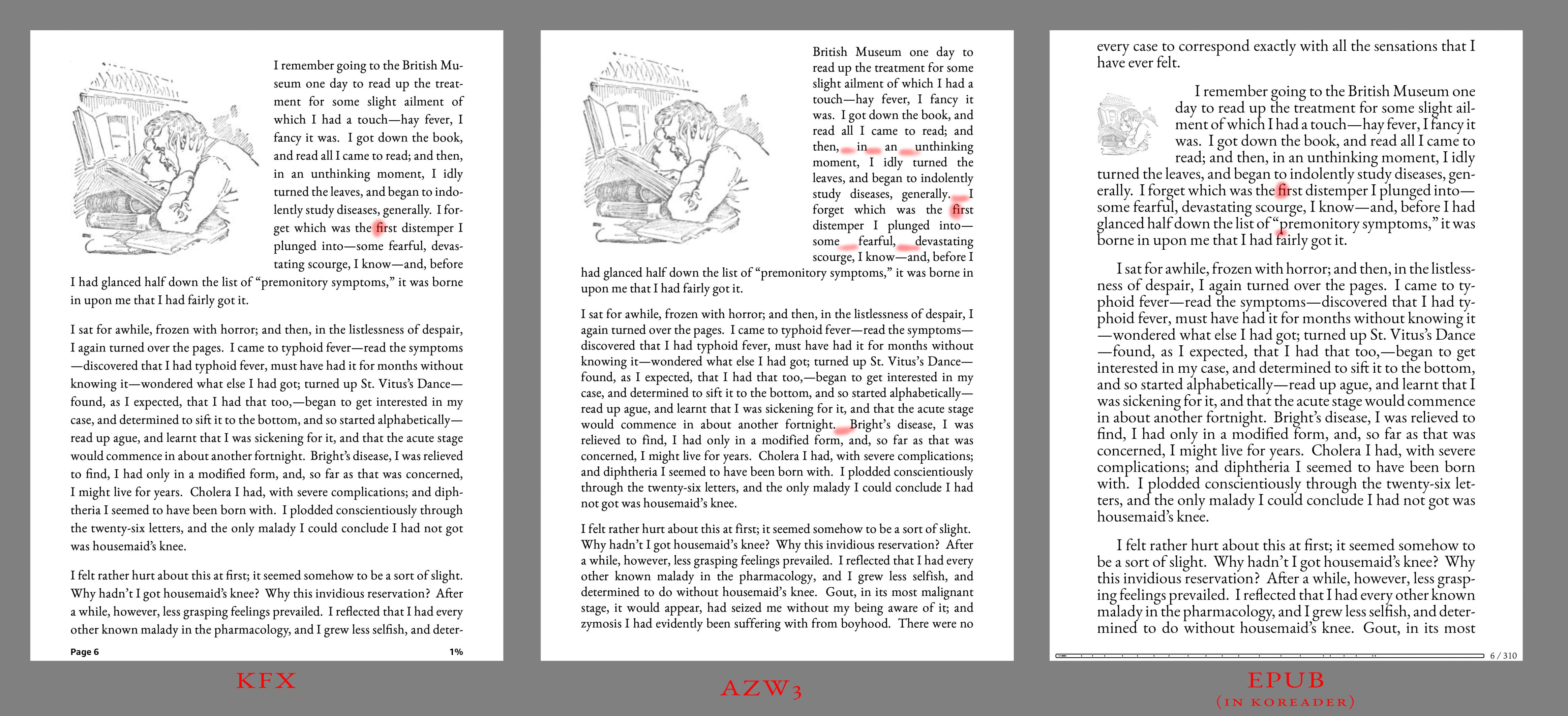 On Kindle, we've the choice between AZW3 and KFX, and KFX in most cases works the best, even compared to EPUB, if it's running in KoReader. That's a plain fact, as far as I'm concerned. I see nothing that would disprove it. Maybe KFX is worse than other formats on other readers, I'm not judging that. But if you think that it is, I'd really like to see some proofs of that, not just pointless talk. I think the topic if fit for a separate thread, so I'll start it when I find some time to do it. In the meantime, I've done a few quick comparisons. All images are 1:1 screenshots from Kindle. Same book, same fonts, same font setting regarding KFX and AZW3. Major differences are in red. Notes: Spoiler: