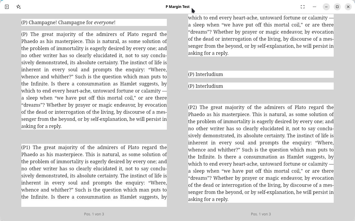I wanna design for the PocketBook Reader app (iOS and Android) and keep struggling to set margins for paragraphs. Although PocketBook processes margins for div and some other tags properly, it refuses to apply my custom settings to p-tags. I've even raised precedence to almost maximum, but no satisfaction in sight...