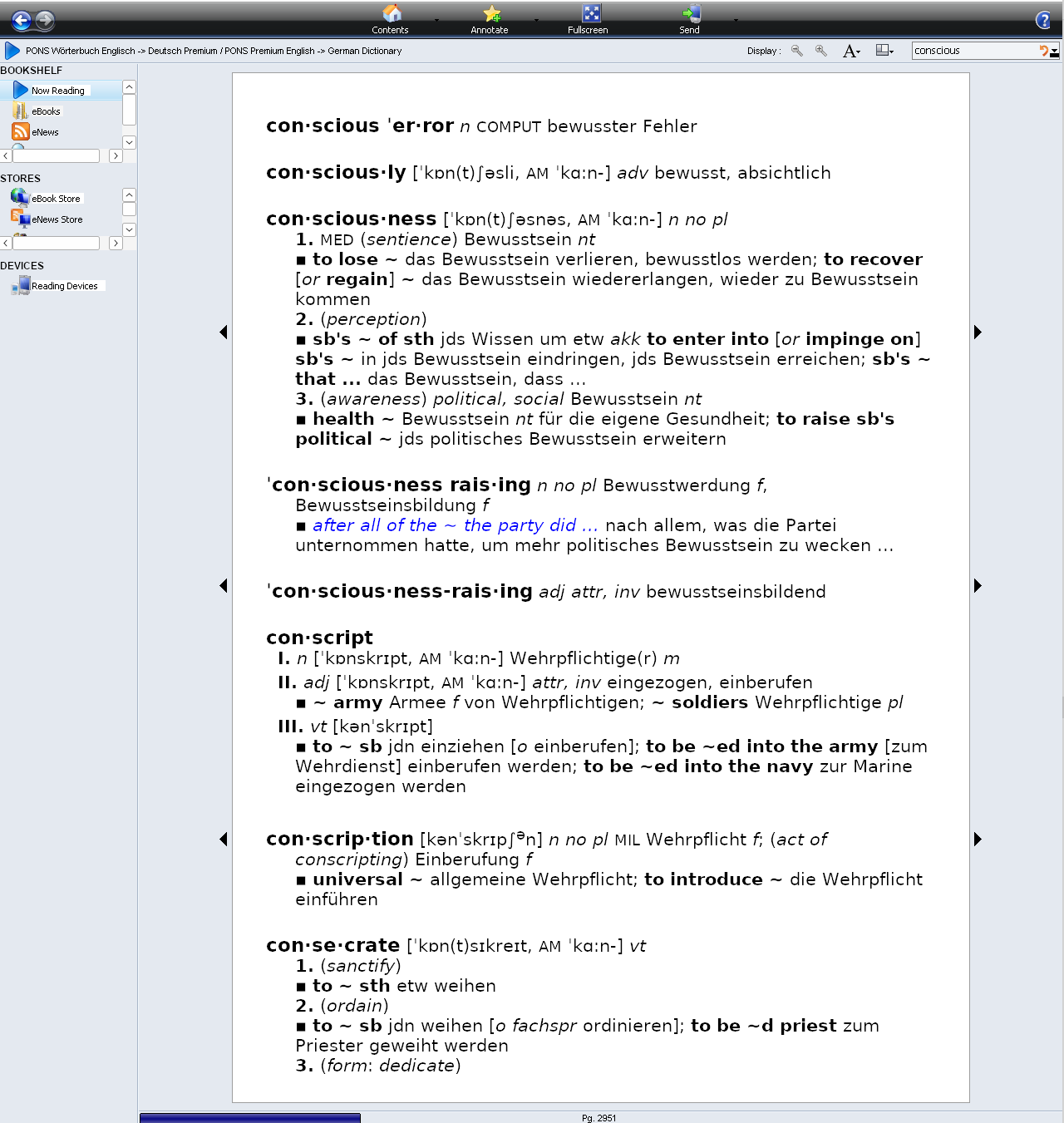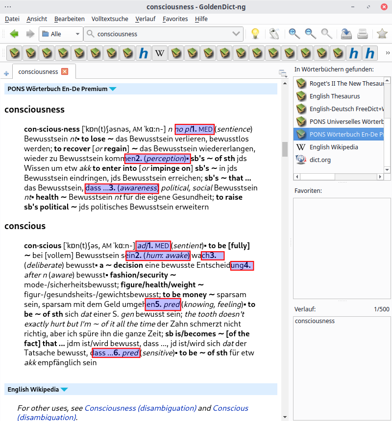 Have been watching your incredible work with dictionaries for a few years now. Let me say thank you on behalf of all those who need or just love dictionaries and can’t handle the plethora of different formats themselves! Personally, I have decided on the StarDict format long ago, and have my "standard set" of dictionaries that I use with GoldenDict-ng on my Linux computers, and (a subset) on my Pocketbook e-reader (with KOReader). Today I had a quick look at your PONS Worterbuch En-De Premium_Stardict_15thMAy2020.zip, just to check out if the premium would be better than my regular PONS EN-DE/DE-EN. Compared to mine, I noticed that you (or the source) have removed the resources subfolder "res" and all colour information. Not much of a loss, thinking of e-readers, especially because the PONS resources are mainly just coloured & numbered bullet points. But I found the numbered sections (like 1., 2., 3.) are a bit glued together and hard to read. I think these should originally be ordered lists. Would there be a chance to redo these, with a bit nicer visual display? I attach a (GoldenDict-ng) screenshot for the word "consciousness", showing my original PONS and yours. |