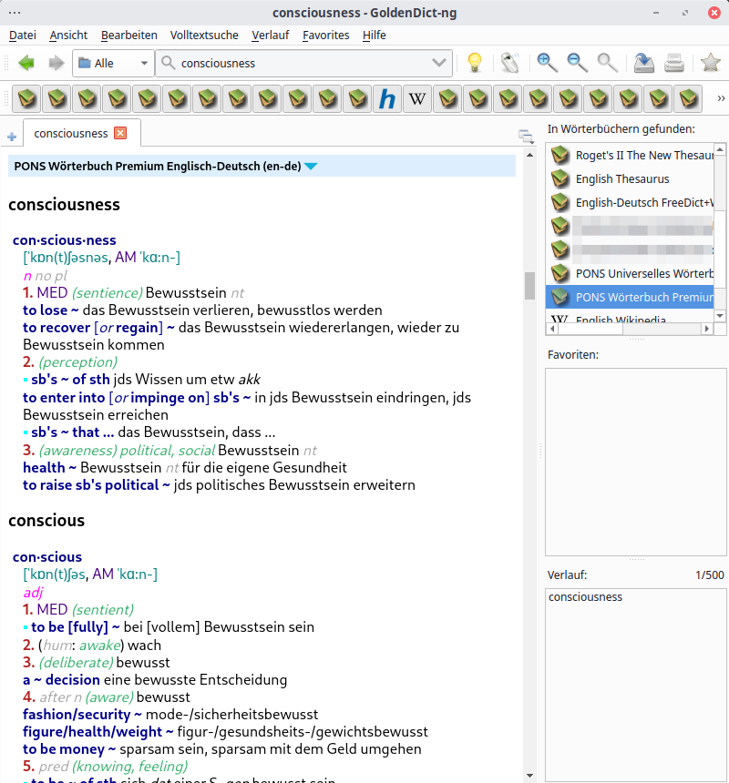 <article> <key>consciousness</key> <definition type="h"> <![CDATA[<p style="padding-left:0.3em;margin:0"><span style="color:#000080"><b>con·scious·ness</b></span></p><p style="padding-left:1em;margin:0"><span style="color:#008080">[ˈkɒn(t)ʃəsnəs</span>, <span style="color:#4B0082">AM</span> <span style="color:#008080">ˈkɑ:n-]</span></p><p style="padding-left:1em;margin:0"><span style="color:#FF00FF"><i>n</span> <span style="color:#A9A9A9">no pl</i></span></p><p style="padding-left:1em;margin:0"><span style="color:#B22222"><b>1.</b></span> <span style="color:#4B0082">MED</span> <span style="color:#3CB371"><i>(sentience)</i></span> Bewusstsein <span style="color:#A9A9A9"><i>nt</i></span></p><p style="padding-left:1em;margin:0"><span style="color:#00008B"><b>to lose ~</b></span> das Bewusstsein verlieren, bewusstlos werden</p><p style="padding-left:1em;margin:0"><span style="color:#00008B"><b>to recover</b> [<i>or</i> <b>regain</b>] <b>~</b></span> das Bewusstsein wiedererlangen, wieder zu Bewusstsein kommen</p><p style="padding-left:1em;margin:0"><span style="color:#B22222"><b>2.</b></span> <span style="color:#3CB371"><i>(perception)</i></span></p><p style="padding-left:1em;margin:0"><span style="color:#00FFFF">▪</span> <span style="color:#00008B"><b>sb's ~ of sth</b></span> jds Wissen um etw <i>akk</i> </p><p style="padding-left:1em;margin:0"><span style="color:#00008B"><b>to enter into</b> [<i>or</i> <b>impinge on</b>] <b>sb's ~</b></span> in jds Bewusstsein eindringen, jds Bewusstsein erreichen</p><p style="padding-left:1em;margin:0"><span style="color:#00FFFF">▪</span> <span style="color:#00008B"><b>sb's ~ that ...</b></span> das Bewusstsein, dass ...</p><p style="padding-left:1em;margin:0"><span style="color:#B22222"><b>3.</b></span> <span style="color:#3CB371"><i>(awareness) political, social</i></span> Bewusstsein <span style="color:#A9A9A9"><i>nt</i></span></p><p style="padding-left:1em;margin:0"><span style="color:#00008B"><b>health ~</b></span> Bewusstsein <span style="color:#A9A9A9"><i>nt</i></span> für die eigene Gesundheit</p><p style="padding-left:1em;margin:0"><span style="color:#00008B"><b>to raise sb's political ~</b></span> jds politisches Bewusstsein erweitern</p>]]> </definition> </article> The reconstructed xdxf file for Pocketbook looks different though Code: