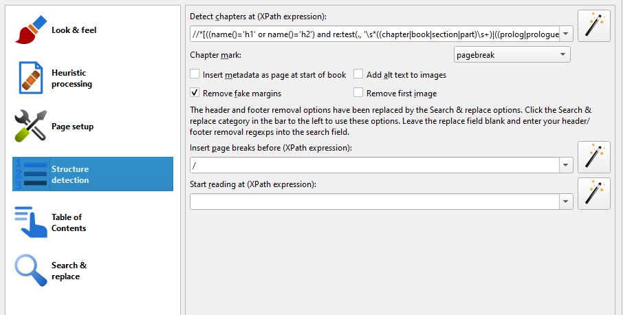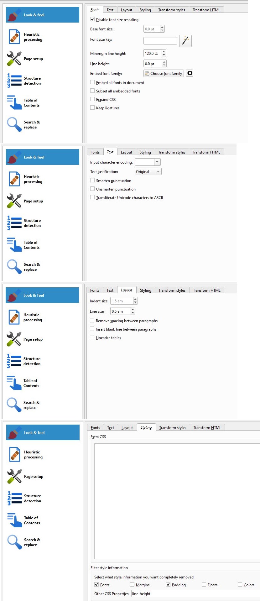 I have attached my settings, some of them will probably need to go - what are your suggestions? Heuristic processing is disabled. I am not sure in particular what to put in Fonts and Styling. Also, shall I activate "Do not split on page breaks"? Not sure what the practical implication of that setting is. |