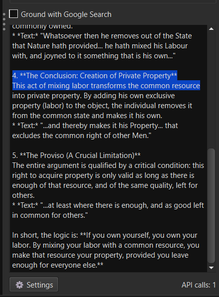For this, the prompt I gave to the LLM was "Summarize the logical structure of this passage regarding property." The results are attached as screenshots. I could also give examples of bridging knowledge gaps - for example, you read "Congress of Vienna" or "liminal spaces" and you want to quickly know about them. I could also give examples of confirmation of understanding - like asking whether a sentence is a supporting example of the narrator being unreliable when you think it is (or isn't). The point is to be able to do all this in a simple no-need-to-go-to-a-separate-tab manner. The result would be a substantial time-saver for those who are already using external LLMs for such tasks, or for those who just may want to potentially try something out to enhance their reading. Ultimately, my intention was that this'd be a user-configurable option. That'd mean if one is concerned, they can simply choose not to enable or use it, and it wouldn't interfere with their existing Calibre experience. For those who find value in LLMs (and there is a growing number who do), it offers a streamlined + integrated way to utilize them. Thank you again for your candid and thoughtful reply, rantanplan. It has provided me with valuable perspective, and I truly appreciate the engagement. |