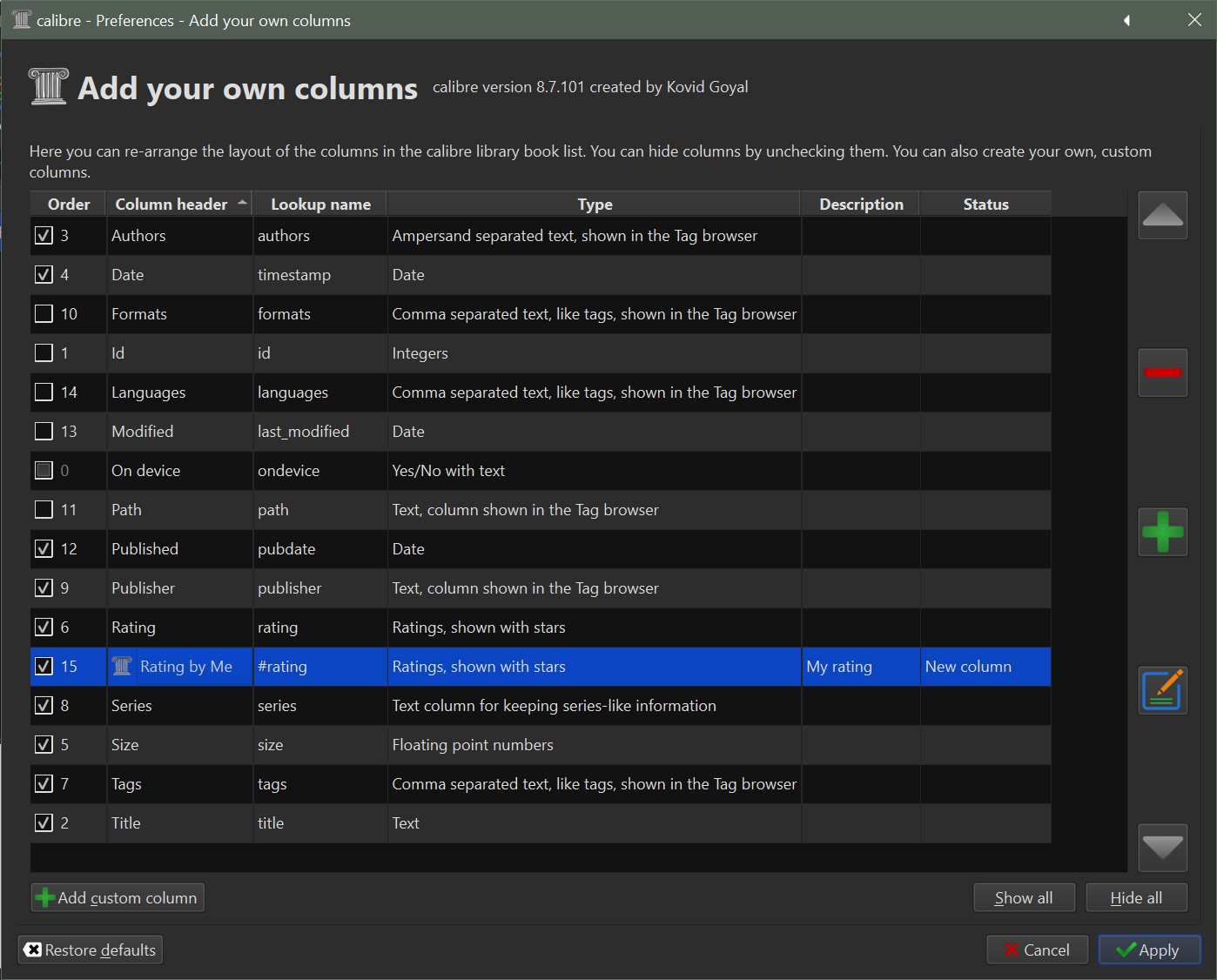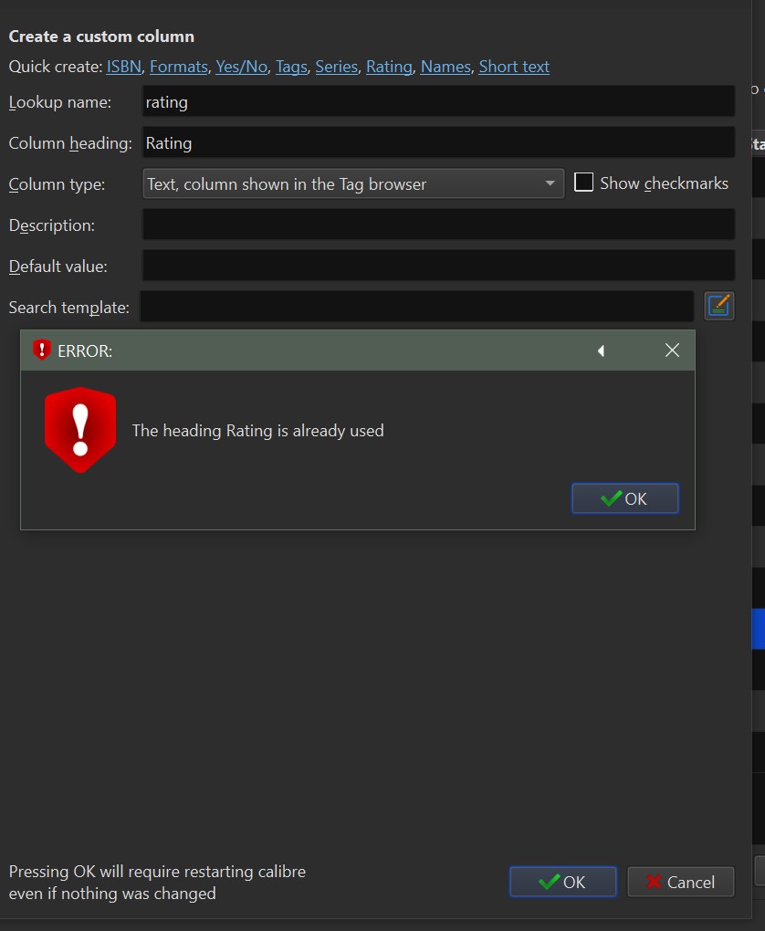 I'm having an issue with creating a custom rating column in Calibre. I've tried to create a new column with a specific name, but it says the column already exists. I understand that it's one of the default columns created by Calibre, and I can't delete it. I want to have a rating column with that name, similar to what is described in the link below: