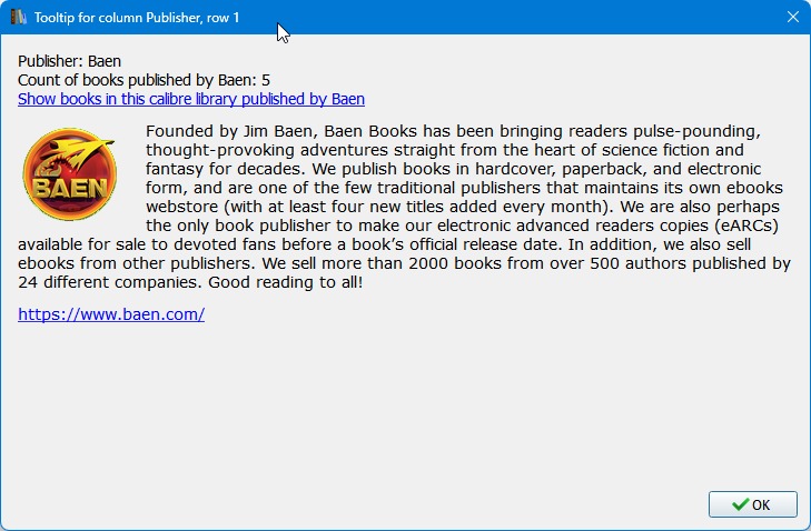This template generates a tooltip showing the note for the publisher, if any. It also shows the count of books by that publisher and a link to search for the publisher in the current library.