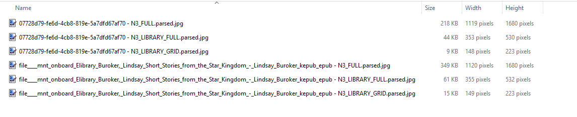 If I look at the .kobo-images directory on my KLC, each book has 3 images which for me show as shown in the image below (I renamed the files to *.jpg). These files are generated from the cover image during the import process. When I look at the details in device view of a book, I see the resolution corresponding to the N3_LIBRARY_FULL.parsed image. |