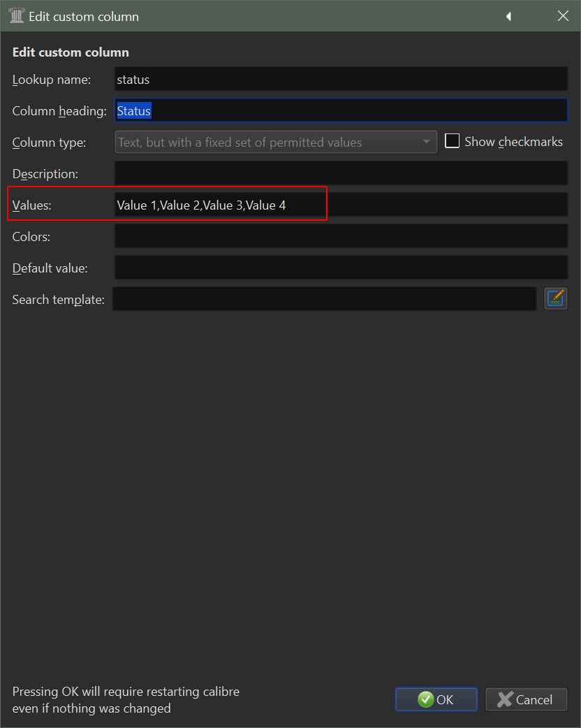 Preferences > Add Your Own Column From there find the column you want to update/make changes to and double click it. Next find the Values column and update/make changes. Click ok. Click Apply. Popup will say to restart calibre. Click restart. When Calibre comes back up, your changes/updates should be in their appropriate column. |