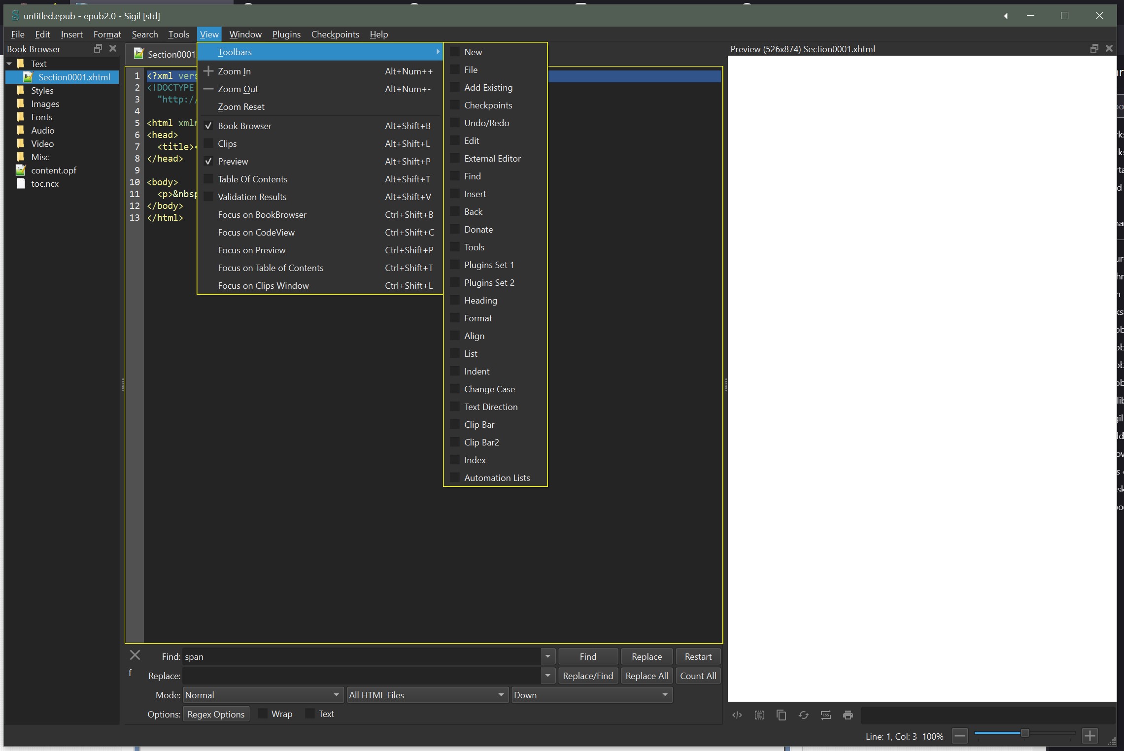 Then I pushed all of the automation menu changes to normal Sigil master. This new feature will appear in the next release of Sigil. Over the next couple of days I will be uploading beta builds from our CI builds so that all interested parties can test with it. These changes are going to need a lot of testing to make sure they do not break anything for anyone else. For those who build from source you can pull and build from normal Sigil master. |