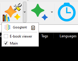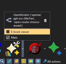 This plugin provides quick toolbar access to Calibre’s AI settings' dialogs for the E-book viewer and library context, what I called 'Main'. It's a single toolbar button with a popup menu for three entries: e-book viewer, main settings and current provider/model. Starting from version 1.0.1, the current provider/model is now shown with a tooltip and a copy-to-clipboard button for easy access. Shortcuts can be assigned for each dialog. Installation [Load from file] 1. Download the latest release zip file 2. In Calibre, go to Preferences → Plugins → Load Plugin from File 3. Select the downloaded zip file 4. Restart Calibre Support If you encounter any issues or have suggestions, check this MobileRead thread! Release notes Spoiler: