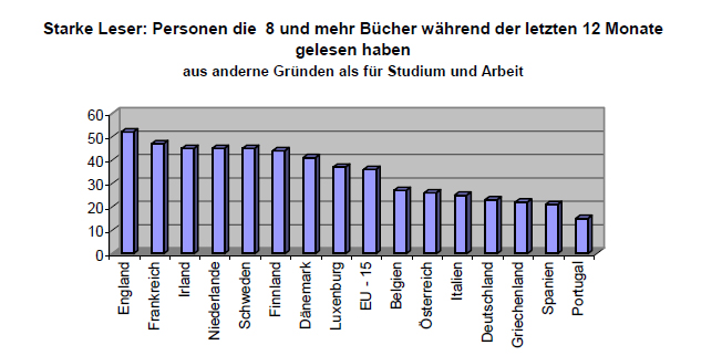 Hallo allerseits, ich lese gerade eine Studie bzgl. Leseverhalten in Europa. 75% aller Befragten lesen weniger als 8 Bücher pro Jahr (Bücher für Arbeit oder Studium nicht mitgezählt). Können wir besser, oder