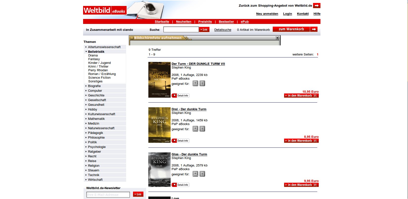 Hallo, also ich habe nochmal geschaut, ob ich mich vielleicht vertan habe, aber bei der Detailsuche Autor Stephen King unter E-books habe ich folgendes gefunden ( siehe Anhang )