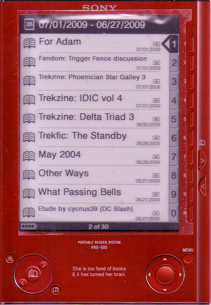 Well, it sort-of works. The ebooks are all there, in reverse-added order. But they're all showing up under *today*, regardless of the actual date. (It lists the date. But they're all listed under the 1st tab number.) See attached image. Anyone know what causes this, or how to fix it? If it turns out not to be fixable, I won't worry; it's a nuisance, but not a major hassle. Background techie info: I haven't used the Sony Library since I got my Reader back from them; it's on the computer that's currently down. It's not on my laptop. I can't easily re-download it; I have dialup internet at home. (I downloaded it from work before, and brought it home on a flash drive. However, either work changed its internet permissions or Sony changed it's download method; now when I try to download, I get a 10kb mini-program that won't run. I suspect work has disabled some .exe downloads.) If I must, I'll set aside a couple of hours to re-download it (I remember it being somewhat more than 20mb?) to install on the laptop. I'd rather not, though. Have not re-installed firmware, either. Have same problem with trying to download it. (Not sure how I can tell what version of firmware my Reader is running.) Can't download from work, but I remember the firmware being nonpainful to download from home. Haven't installed the PRC Customizer. I'm considering it because it's got some features I'd like, but I'm nervous about doing it on top of not-quite-working firmware. Have installed books through Calibre. Mostly, I use Windows to install/uninstall ebooks with drag-and-drop. I have Windows XP on three different computers (home, work, laptop). Not sure if that matters. |