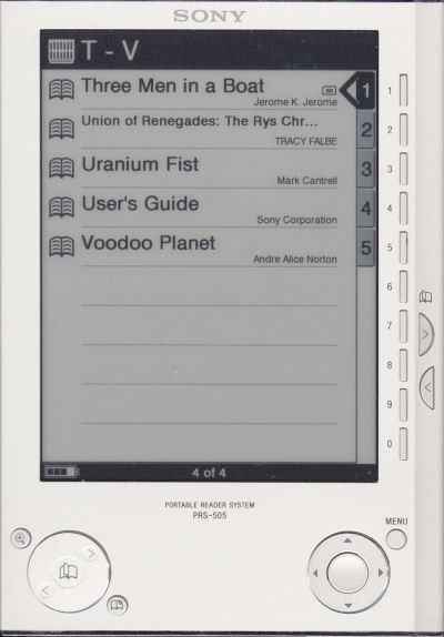 Now just copy any compatible eBook file onto the SD card. In my second attached file ("SonySDCard.gif"), you'll see that I copied a PDF file into the root directory. And in the third attached file ("SonySDCard-2.gif") you'll see that I uploaded an ePub file into the drive:\Sony Reader\database directory. The fourth and fifth attached files ("SonyScan-1.jpg" and "SonyScan-2.jpg") show these two books on the Sony reader. Note the little icon next to the title indicating that the book is on the SD card. |