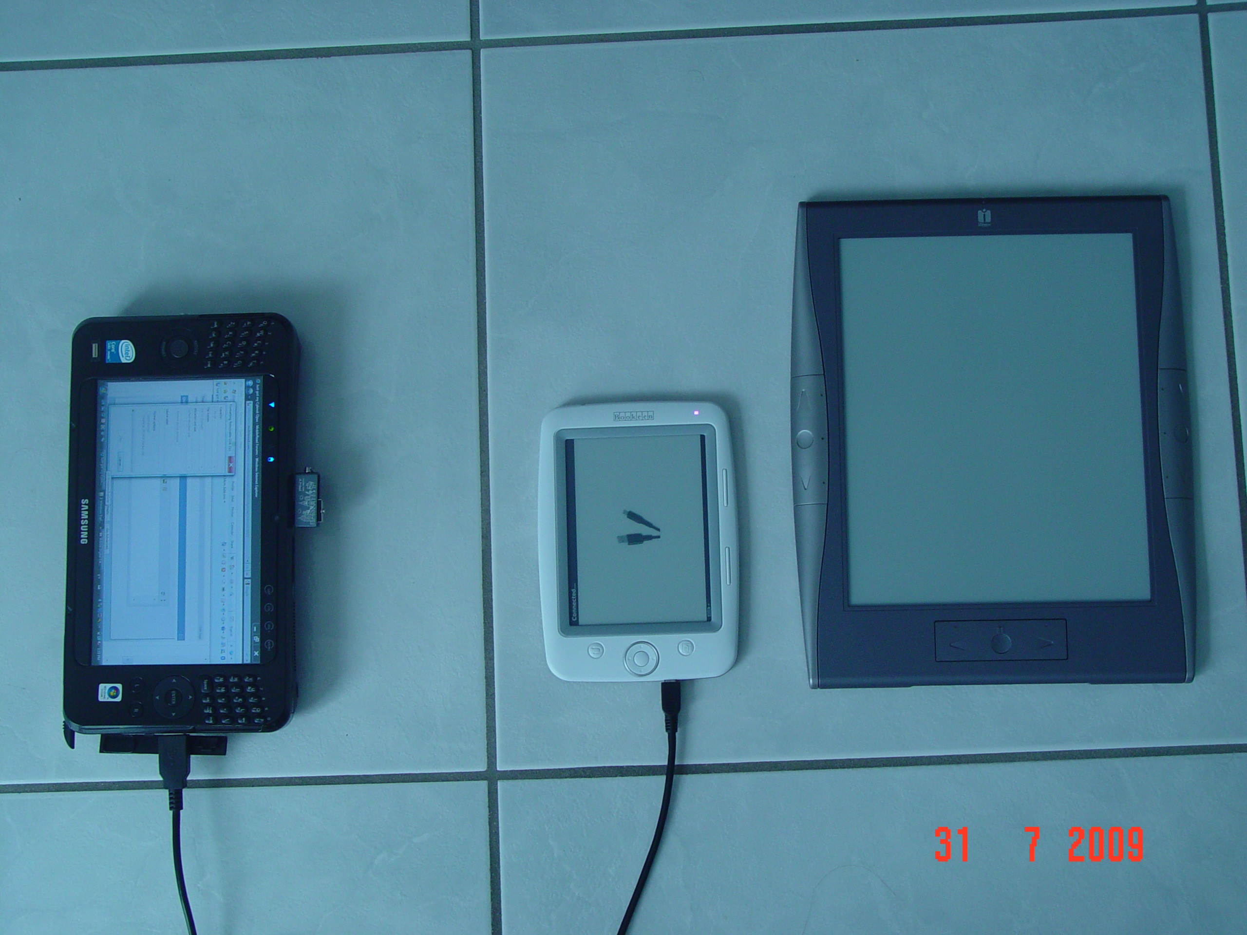 First impression: Wow, I didn't expect it being that small. It's not too far from my old PDAs, I definitely will be able to carry it with me even when traveling "light". Like it. ![]() It's coming in a protective sleeve, no foldable cover. Don't like that, I'd just like to open it like a p-book instead of taking it out of the sleeve. I'll check out for alternatives. But: At least it comes with protection. Lots of the other readers come without any kind of protection. I'll compare boot time and other details in my thread "8+ readers" (now it's 9+). Screen orientation works flawlessly. Initial boot was surprisingly slow. Maybe (hopefully) just for the first time, generating indexes or something like that. Battery indicates 90%, so I can test right ahead. Menu structure ist quite similar to Cybook Gen3, of course. I love the thumbnail view and can't understand, why most of the other readers don't use it. Only Sony 700 has a similar feature. I'd really love to see it on Kindle DX's or iRex 1000S's huuuuuge displays. ![]() Display quality: Briefly checking the user guide. I'm not too enthusiastic about the cover graphic. Looks a bit "fuzzy", have to compare the very same book/graphic on different readers to check in detail. Text is great though, no complaints so far. And again: The size of the unit is really cool. Reminds of slightly oversized PDA.... More in my thread.... FILE FORMATS: SURPRISE! ![]() ![]() QUOTE from USER GUIDE: Adobe PDF/ePUB (DRM/non-DRM) Mobipocket (DRM/non-DRM) What? Both of them? Wasn't aware of that, have to test... Would be BRILLIANT! ![]() ![]() ![]() UPDATE from Bookeen's website: "Note: Mobipocket support can be available via firmware upgrade. Adobe and Mobipocket DRMs can not be supported at the same time". Well, would have been nice. ![]() ![]() ![]() ![]() ![]() ![]() ![]() Attached: Pic iRex 1000S - Samsung Q1 - Cybook Opus Last edited by mgmueller; 07-31-2009 at 08:04 AM. |