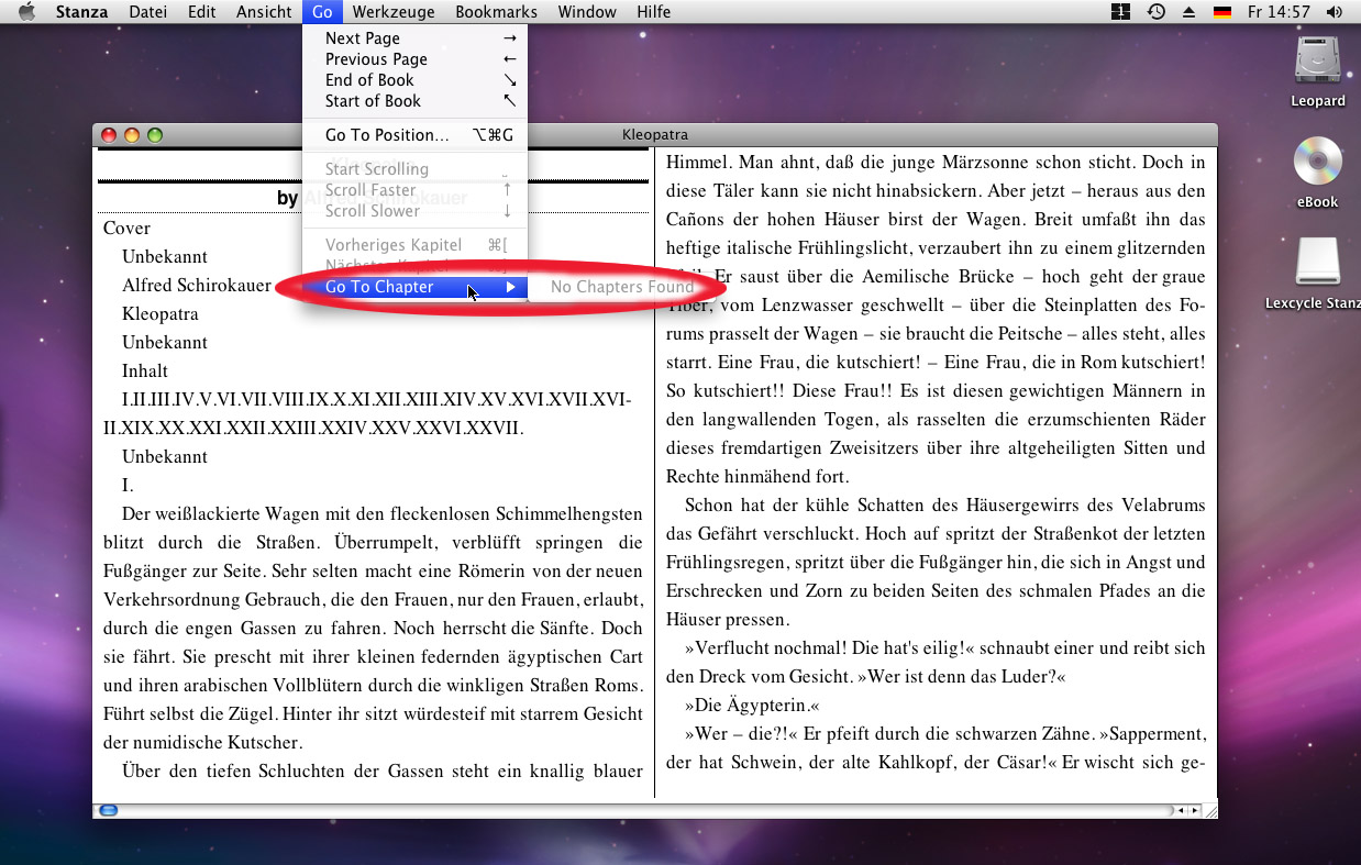 ![]() Leider bin ich ziemlich entäuscht. Ja, es gibt zwar bedeutend mehr Funktionen als in der Windowsversion, aber diese sind nicht wirklich überrragend und betreffen eigentlich nur die Ansicht. So kann man zum Beispiel zwischen verschiedenen Hintergrundfarben wählen und entscheiden in wie vielen Reihen der Text angezeigt werden soll. CSS wir nur teilweise unterstützt (sieht nicht wirklich schön aus, da keine verschiedenen Schriftgrößen etc. ), Cover und Illustrationen hingegen überhaupt nicht.Zuerst war ich erfreut dass Stanza wenigstens ein Verzeichnis der Kapitel anzeigen kann. Die Ernüchterung kam dann aber ziemlich schnell: Bei beiden eBooks die ich ausprobiert habe, Dein Kleopatra und mein Weihnachtslied, kann Stanza keine Kapitel finden. Calibre erkennt bei beiden eBooks die Kapitel ohne Probleme (in der iPhone-Version übrigens auch). Ich habe jetzt noch ein paar Screenshots angehängt damit Du dir selber ein Bild machen kannst.