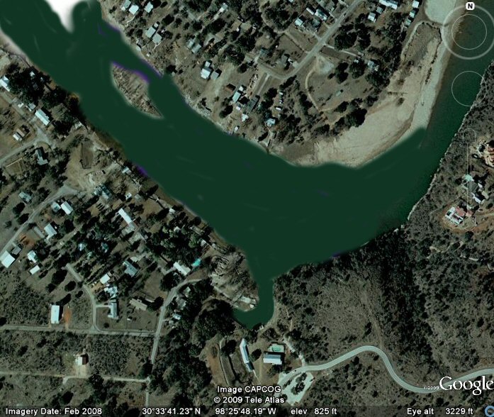 I took a screen shot, and filled in where the water "should" be, and isn't. That concrete apron that looks like it's being built is actually the boat launch area for the town across Sandy Creek from us (which is called "Sandy Harbor").