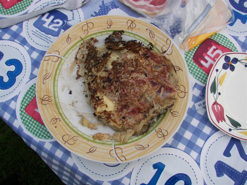The first is the setup. It's made from an old lorry tire rim (if that's the correct word). The baking plate is also made from the same material. Ok, put some oil in and then the batter (the brown rim on the batter is the oil). put the cheese on and the (slightly pre-fried) bacon. Wait a bit and pour a second (much thinner layer of batter on top of that. Turn it around, wait a minute or so and put it on your plate. Result on the third picture! Yummie! (naturally, if you actually bake in a baking pan, you'll get much rounder results )