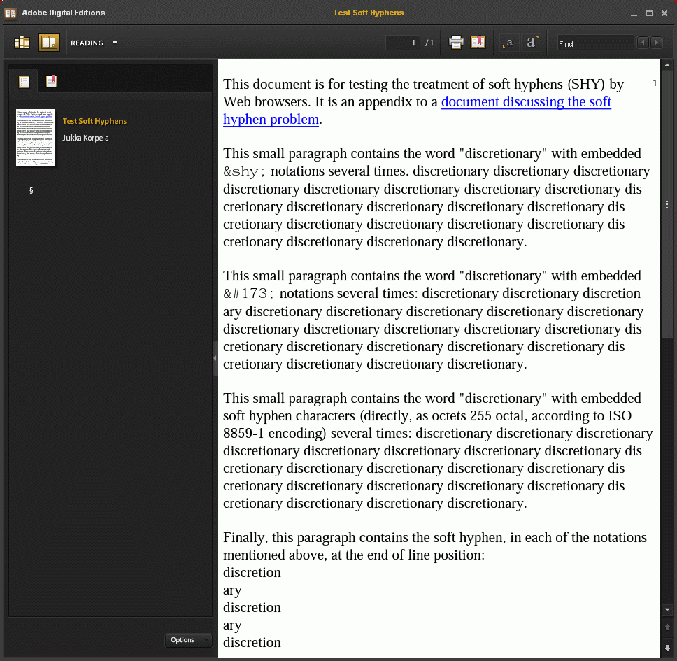 The attached ebooks are based on http://www.cs.tut.fi/~jkorpela/shytest.html, which is from Soft hyphen (SHY) – a hard problem?. I enclose a single-file HTML (ZIP), MOBI (via MobiPocket Creator) and ePub (via BookGlutton) versions. The screenshots are from a Windows PC using Adobe Digital Editions, Sony Ebook Library (PRS-505 like), MobiPocket Reader, FBReader and uBook. The uBook version (last screenshot) appears to do the best job, but it does not display the "-" when a soft hypen is positioned at the end of a line in the actual document and it might in fact be ignoring all the soft hyphens and using its own hyphenation (it can give discre-tionary, which isn't from the soft hyphens). Adobe Digital Editions (ePub) breaks on a soft hyphen, but does not add a "-" when it does so. Sony is based on ADE, it breaks on a soft hyphen but it also shows "?" at every soft hyphen. MobiPocket shows all soft hyphens as "-" and does not break words. FBReader does break words, but shows all soft hyphens as "-". Soft hyphens could provide a viable alternative (or augmenation) to on the fly hyphenation, but only if ebook readers either use them for hyphenation or ignore them completely. |