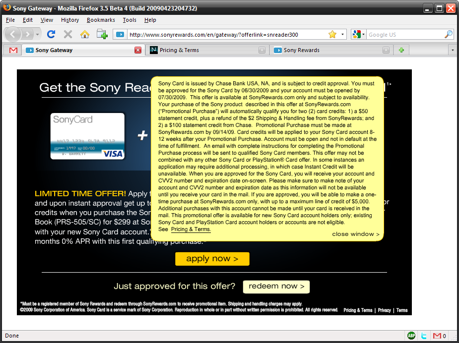 I didn't buy anything else within that 45 day period but have since put stuff on the card. Did anyone not get the 100 dollars back from chase? Please check your statements, I bought my ereader on 6 /15/09 I want to thank the person who posted the pictures from sony website, this is the one that I think makes me feel I didn't have to buy anything more since this was the promotional price of 299 in ad. I think the part where it says buying this promotional item will automatically make you eligible for the 2 credits that made it seem like it was a done deal. Last edited by richman; 09-04-2009 at 12:57 PM. |