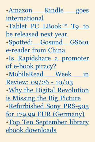 links do work, and the lines are separate, but you are correct - they are no displayed as separate bullets... but that did not spoil my impression from that page - it was very readible, even inspite that it did not "bulletize" each piece of news. Maybe... heh... let me check it - maybe I should've make the font smaller? I'll try and if it does break them into bullets with the smaller font - I'll let you know... Dictionaries do work in prc, and almost in all other formats (no djvu, pdf). |