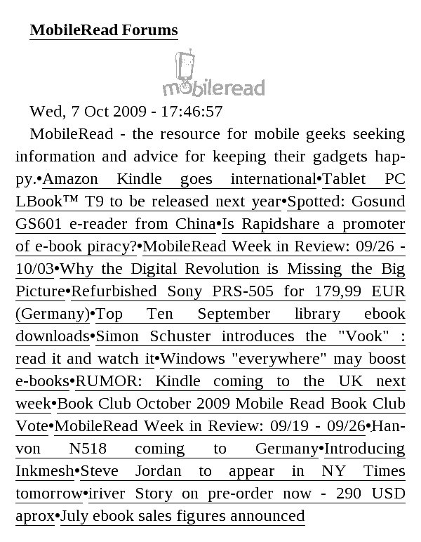 links do work, and the lines are separate, but you are correct - they are no displayed as separate bullets... but that did not spoil my impression from that page - it was very readible, even inspite that it did not "bulletize" each piece of news. Maybe... heh... let me check it - maybe I should've make the font smaller? I'll try and if it does break them into bullets with the smaller font - I'll let you know... Dictionaries do work in prc, and almost in all other formats (no djvu, pdf). |