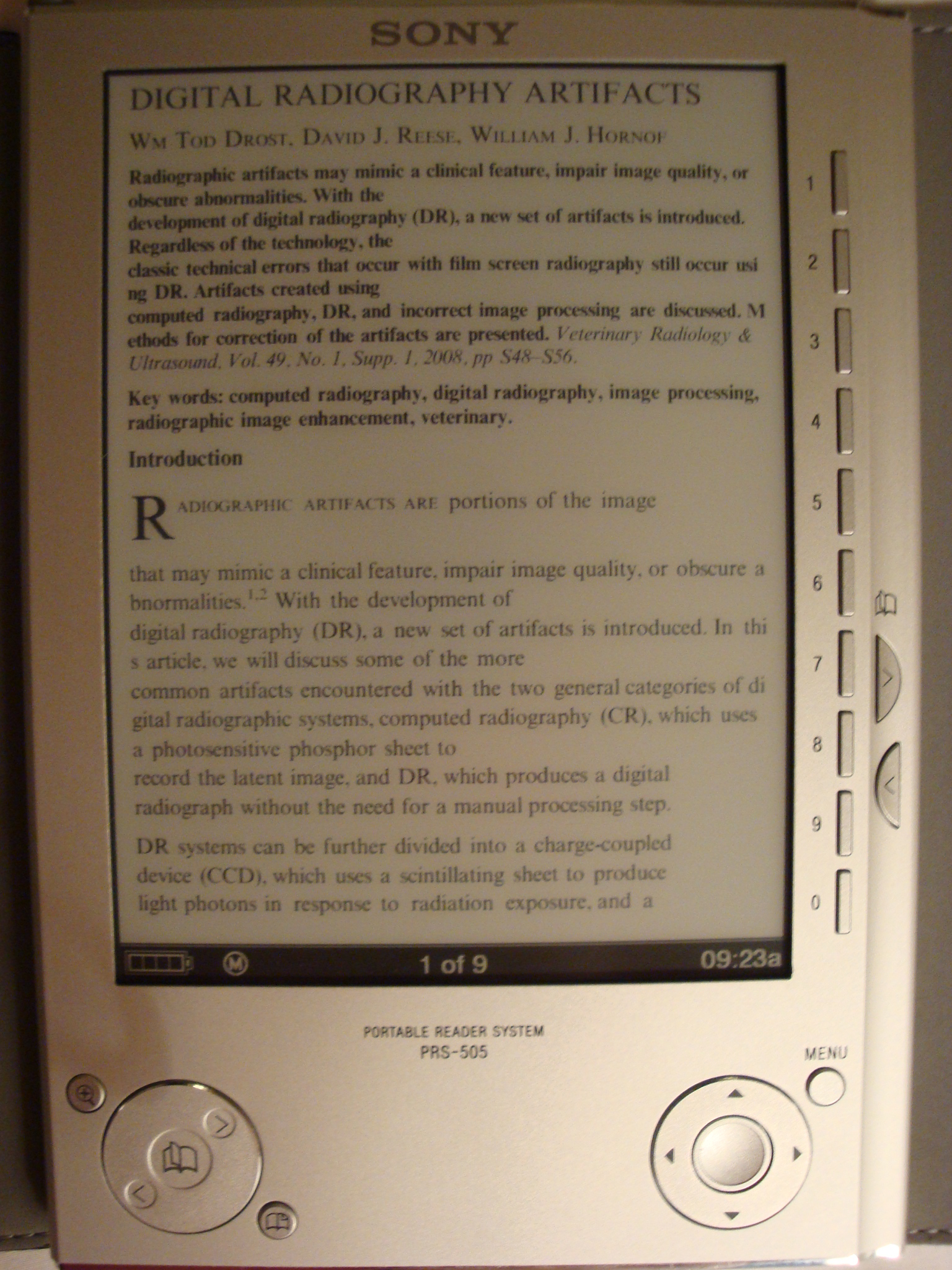 I have handled a Sony Touch demo unit and didn’t have an issue with screen contrast, it seemed to mechanically fit well in my hand, etc. 1) PDF files—I’ve seen some info suggesting the Sony does these quite acceptably. Others say it sucks. Still others say it’s fine if you manipulate the file in some way to optimize it. I do not now how to do this and have minimal interest in learning how. Most of what I will be reading is from sources like this. If anybody could give me a screen shot (this page links to a free content edition of the journal, so I don’t THINK copyright is an issue), I would be deeply grateful. Even better would be a few different ones (portrait vs. landscape, different magnifications, etc). Image display isn’t as important as you might think as long as the text displays in a readable fashion. 2) Taking notes—It is currently my habit to print out articles from journals to read, and to jot down notes in the margins. I tried this in the Sony demo, but couldn’t figure out how to ever see those notes again. The highlighted bits I tried seemed to work fine? I don’t necessarily need to save the notes forevermore (e.g. to print out or to e-mail to somebody), but when I look back at that article in a week or a month I need to have the notes. I know the first release of the Irex is not supposed to have note-taking ability, but they say that will come out as a firmware update. Does Irex have a reputation of living up to such promises? 3) Stylus—I know the Sony is basically a pointed stick and any similar object can be used. I understand that the Irex has some kind of unit-specific device. I tend to lose things. Anybody know how much that would be to replace? If it’s not a literal TOUCH screen, do you have to have that specific stylus to operate the thing at all, until you get a replacement? Or is there some method of limping along and still read? 4) File organization—again, largely PDF files, not books. Once I have an article on there, I need to be able to find it again. Ideally, I would want to file it under many different categories (e.g. “MRI”, “Equine Orthopedics”, “November Journal Club”). Subfolders would be great but I can survive without them. 5) Bookmarks—can you bookmark files (not books)? Can you have more than one bookmark in a file or is it strictly a means of getting back to the last page you were on? 6) Ease of transfer—Can I hook the unit up to any (PC) computer and dump files onto it the way I can a jump drive? Or does there have to be some kind of reader software on the computer that it goes though? I’m a bit of a nomad at work, working on a variety of public stations. I want this to be as easy (or almost as easy) as selecting “print” and walking to the nearest networked printer. It would be a big fat drag if I had to dump files onto a jump drive, walk back to my private office (which is two floors up and technically in a different building from where I actually work), upload those files into a library program of some kind, then transfer them onto the device. Add some kind of conversion step in there and it’s probably a deal killer. 7) Random notes—it seems like the Sony can easily function as an electronic notepad to jot down a few things as they come along. Can those files be organized in any way into folders, or is it just a list. This isn’t a deal killer, it can’t be any worse than a literal pad of paper. Or the billions of little scraps of random paper I collect because I don’t have a pad with me. 8) Wireless—other than buying books while sitting in a coffeeshop, what’s in it for me? I’m sure I’ll do some recreational reading with the thing, but it’s not a problem to hook up to a computer to download books for me, even if it’s one specific computer that I need to go to (unlike the PDF issue). Also, does anyone know if the Sony Wireless for the Daily is “free” or if there is a monthly fee? I willing to pay a bit more upfront for the Daily for the larger screen (I think, I want to compare it side-by-side with the Touch first). But I don’t want to pay monthly for a service I’m unlikely to use. I understand the Irex wireless is free? I’m sure I’ll come up with more stupid questions, bear with a poor ignorant soul! |