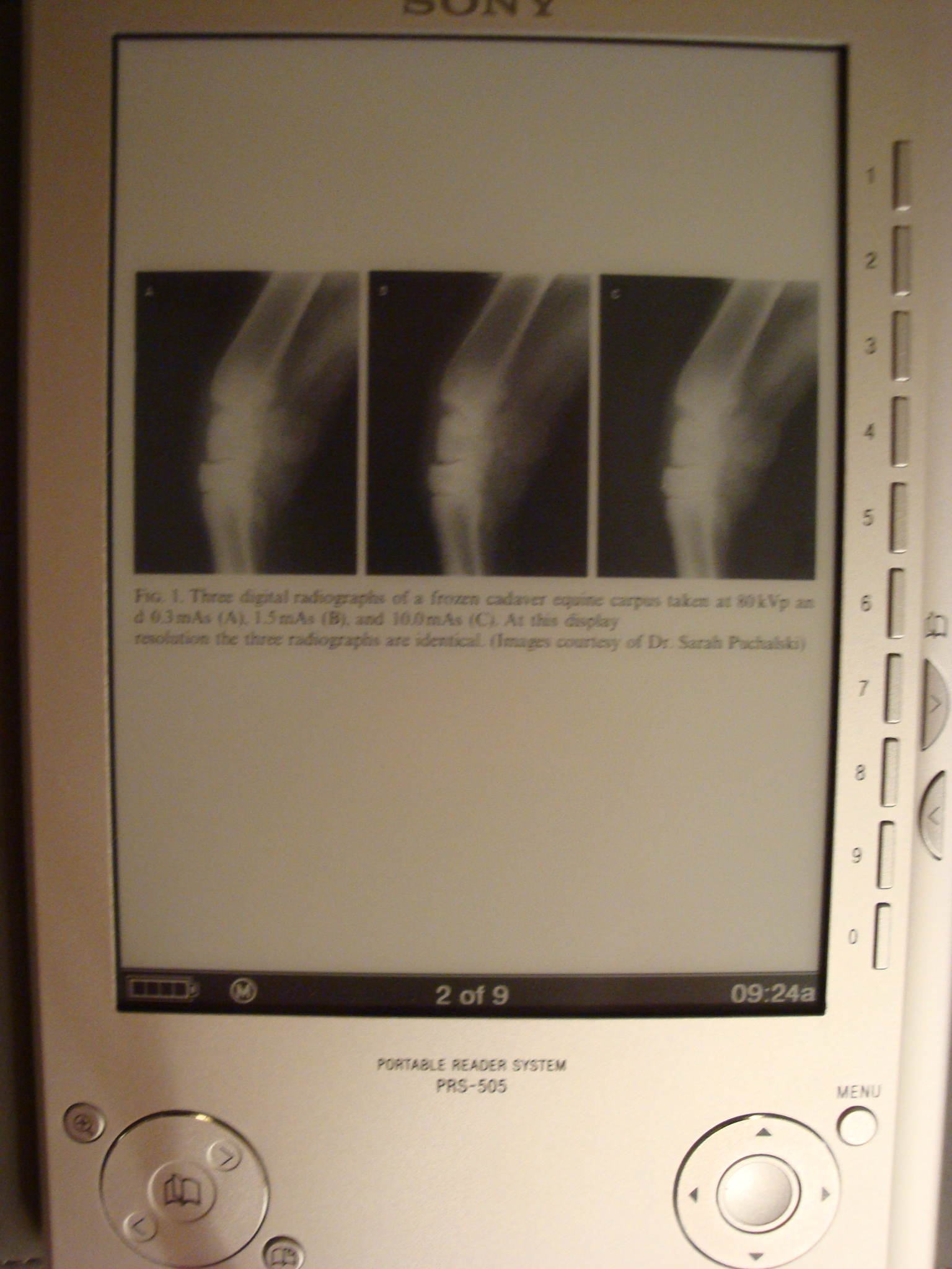 I have handled a Sony Touch demo unit and didn’t have an issue with screen contrast, it seemed to mechanically fit well in my hand, etc. 1) PDF files—I’ve seen some info suggesting the Sony does these quite acceptably. Others say it sucks. Still others say it’s fine if you manipulate the file in some way to optimize it. I do not now how to do this and have minimal interest in learning how. Most of what I will be reading is from sources like this. If anybody could give me a screen shot (this page links to a free content edition of the journal, so I don’t THINK copyright is an issue), I would be deeply grateful. Even better would be a few different ones (portrait vs. landscape, different magnifications, etc). Image display isn’t as important as you might think as long as the text displays in a readable fashion. 2) Taking notes—It is currently my habit to print out articles from journals to read, and to jot down notes in the margins. I tried this in the Sony demo, but couldn’t figure out how to ever see those notes again. The highlighted bits I tried seemed to work fine? I don’t necessarily need to save the notes forevermore (e.g. to print out or to e-mail to somebody), but when I look back at that article in a week or a month I need to have the notes. I know the first release of the Irex is not supposed to have note-taking ability, but they say that will come out as a firmware update. Does Irex have a reputation of living up to such promises? 3) Stylus—I know the Sony is basically a pointed stick and any similar object can be used. I understand that the Irex has some kind of unit-specific device. I tend to lose things. Anybody know how much that would be to replace? If it’s not a literal TOUCH screen, do you have to have that specific stylus to operate the thing at all, until you get a replacement? Or is there some method of limping along and still read? 4) File organization—again, largely PDF files, not books. Once I have an article on there, I need to be able to find it again. Ideally, I would want to file it under many different categories (e.g. “MRI”, “Equine Orthopedics”, “November Journal Club”). Subfolders would be great but I can survive without them. 5) Bookmarks—can you bookmark files (not books)? Can you have more than one bookmark in a file or is it strictly a means of getting back to the last page you were on? 6) Ease of transfer—Can I hook the unit up to any (PC) computer and dump files onto it the way I can a jump drive? Or does there have to be some kind of reader software on the computer that it goes though? I’m a bit of a nomad at work, working on a variety of public stations. I want this to be as easy (or almost as easy) as selecting “print” and walking to the nearest networked printer. It would be a big fat drag if I had to dump files onto a jump drive, walk back to my private office (which is two floors up and technically in a different building from where I actually work), upload those files into a library program of some kind, then transfer them onto the device. Add some kind of conversion step in there and it’s probably a deal killer. 7) Random notes—it seems like the Sony can easily function as an electronic notepad to jot down a few things as they come along. Can those files be organized in any way into folders, or is it just a list. This isn’t a deal killer, it can’t be any worse than a literal pad of paper. Or the billions of little scraps of random paper I collect because I don’t have a pad with me. 8) Wireless—other than buying books while sitting in a coffeeshop, what’s in it for me? I’m sure I’ll do some recreational reading with the thing, but it’s not a problem to hook up to a computer to download books for me, even if it’s one specific computer that I need to go to (unlike the PDF issue). Also, does anyone know if the Sony Wireless for the Daily is “free” or if there is a monthly fee? I willing to pay a bit more upfront for the Daily for the larger screen (I think, I want to compare it side-by-side with the Touch first). But I don’t want to pay monthly for a service I’m unlikely to use. I understand the Irex wireless is free? I’m sure I’ll come up with more stupid questions, bear with a poor ignorant soul! |