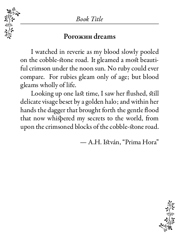 Make sure you try a few different widths... trying both smaller and greater... the poem should, obviously, be centered *visually* (not in terms of raw measurements) and until you've done it a few times, your instinct as to whether or not increase the width or decrease it might be off (unless of course you are increasing the width merely to get rid of unwanted line breaks). I will definitely be making another poetry template that maximizes the content area's width... so if encomium doesn't work out, stay tuned. ![]() - Ahi |