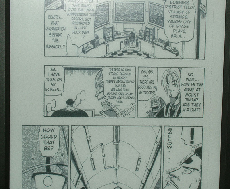 However opened them in photoshop using the settings that you said you had used...I can't really answer your question since they failed to load, but hopefully a kind sony user should be able to help ! =D In that place, i'll make my own images using these settings for you and see how they turn out. In my own images (which I can't show due to licensing issues) the text is crystal clear on both...With 248DPI the image is unreadable at 100%, but stretched it is (quality is same as 166DPI when stretched) Okay, attaching some pictures at the bottom of this post to show example of bad resizing/indexing etc jojo166dpi shows a standard page resized using 166DPI at 800 pixels, this is the PDF at 100% and there are no errors at all..perfectly readable =D jojo43percent shows what happens when an image is too large for the device and is being shrunk, you may see some strange text issues (these will be shown using other examples too) Drifters is a fantastic series ! one of my friends is an assistant to the Mangaka...however, the image was converted using calibre's cybook profile...the PDF is too small and this shows the sort of strange text issues when resizing up or down ;___; rave166dpi shows small text, image is converted and formatted using the same settings as jojo166dpi ! finally jojoindexed is an example of the errors when changing the color profile to a bad color scheme before resizing...The text issues are similar to that of the PDF Resizing using a mobile device... The important thing to remember when making the PDF's using photoshop is to make sure DO NOT DOWNSAMPLE is enabled, if it is enabled =/ well, the image just turns out as unreadable/hard to read junk >.< Good luck again ! |