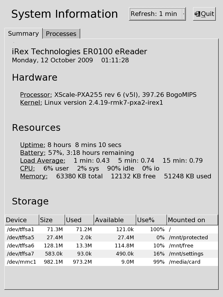This application shows Iliad system information: - cpu - memory - battery - uptime - load - disks - processes Better take a look at the screenshots. Note that it needs last Hansel's lua package (lua5.1-iliad-1.6.6.ipk.gz), not mentioned in this thread. Get it from https://www.mobileread.com/forums/showthread.php?t=58486 Kind regards, Iņigo Serna PS: I'll be away some days, enjoy this |