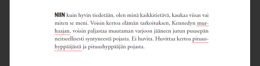 As you can see from the "pdf_sample.gif" file, there are 2 hyphens which just tell to the reader that the word is continueing to next row. If I copy&paste those words manually to notepad, hyphens will disappear and the words are showing correctly but the line feed is wrong as you can see from the "notepad_sample.gif". When I use Some PDF tool to convert PDF to DOC, it leaves all the hyphens and the words are showing incorrectly as you can see from the "word_sample.gif". I should check all the hyphens manually because sometimes those are necessary. I can't just use find&replace and erase all the hyphens. Also, line feed creates sometimes one extra space between words so some words have hyphen and one empty space. That means I really need to check every case manually to see if there is hyphen or hyphen and empty space. Problem is: either I check all the hyphens manually or every line feed. Both options are very troublesome to do manually for books with hundreds of pages. I'm using MS Word to make few styles and then export that DOC file to InDesign and create an e-book. Can you recommend some programs to ease my working process or any other suggestions to make it easier? |