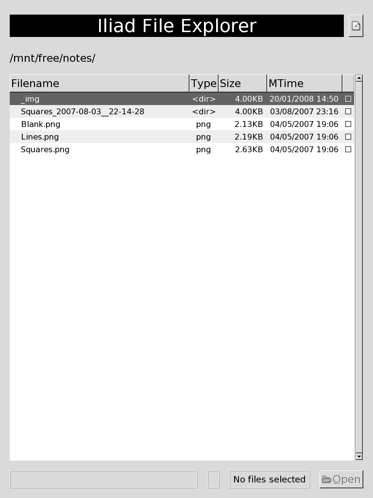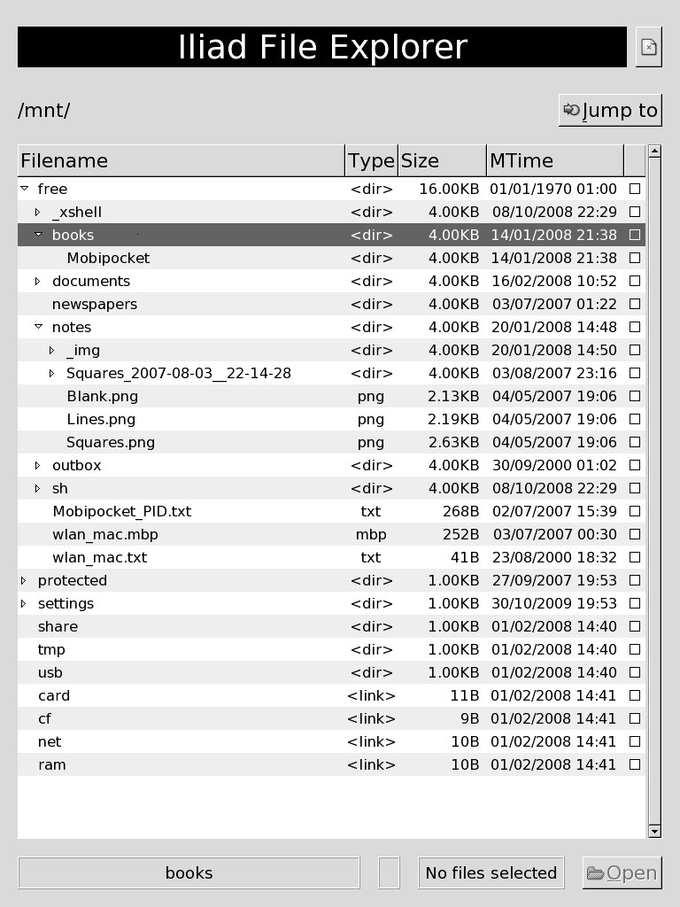 here there is a proof of concept of the File Browser I'm working on to be included in Iliad Toolbox. There is a lot of work yet, but I'm asking for some feedback now because I'm considering two opposite ways. - one uses a flat treeview . To enter into a directory, click in the filename or type columns for the proper row. - the other uses a treeview. . Clicking on a directory, you select it and expand or collapse it, depending on its previous state. . To enter into a directory (and it will also be the new root for the treeview), select it and click on the "jump to" button on the top-right. . For performance reasons, there are only 3 levels of children shown by default. It's an option configured inside the code. If we don't limit it think what would happen when navigating to the '/' of the device, the treeview would contain all the files on the system... too slow. In both cases, you can go a directory up (or more) clicking on the "path" label (left to "jump to" button"). F.e., if it contains "/media/card/books/computers/ai", you could click on "/media/card/" to go there or on "/media/card/books/computers/", etc. It's a pretty effect, you can see it completely running the program on your computer to see the hover effect (edit the initial PATH before executing) that can't be fully appreciated on the Iliad. One of the current problems is that is quiet difficult to press '/' on that path to go the root of your Iliad. Please note that the selection toggle in last column is not handled correctly by now. To test both, move the files to the Iliad and run from a terminal with proper DISPLAY setting: Code: