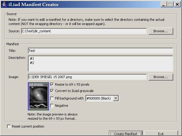 The program can create and edit manifests for documents and directories. It allows to add a title, description and image to the manifest (note that you can use line breaks in the description). The image will be copied; You can also resize it to 69x93, set the background color and convert it to gray-scale (the iLiad's 16 levels). It is also possible to reset the current reading position to page 1. Note that it is possible to drag & drop files and text to the text boxes. It should work in all OS'es (I only tested Windows XP though), and requires JRE 1.4 (or above). Watch out when you create a directory manifest: It moves all directory contents to a subdirectory, because that allows us to have a folder with manifest, but without manifest.xml in the file list (as I found out earlier). So don't try this with system folders! Little request: Does anybody have the original images used by the iLiad (for pdfs, folders, ...)? I wanted to edit them a little, but couldn't find them in the sources (and I don't have shell access). Updates: v1.0 (11-04-2007): initial release v1.1 (12-04-2007): bugfix v1.2 (12-04-2007): bugfix (xml tags are case sensitive ... I didn't know that) v1.3 (13-04-2007): another bugfix (problems with encodings) v2.0 (06-05-2007): Creating manifest for dir no longer moves content to subdir, allow multiple source files (useful for mobipocket ebooks). Last edited by Bert; 05-06-2007 at 12:48 PM. |