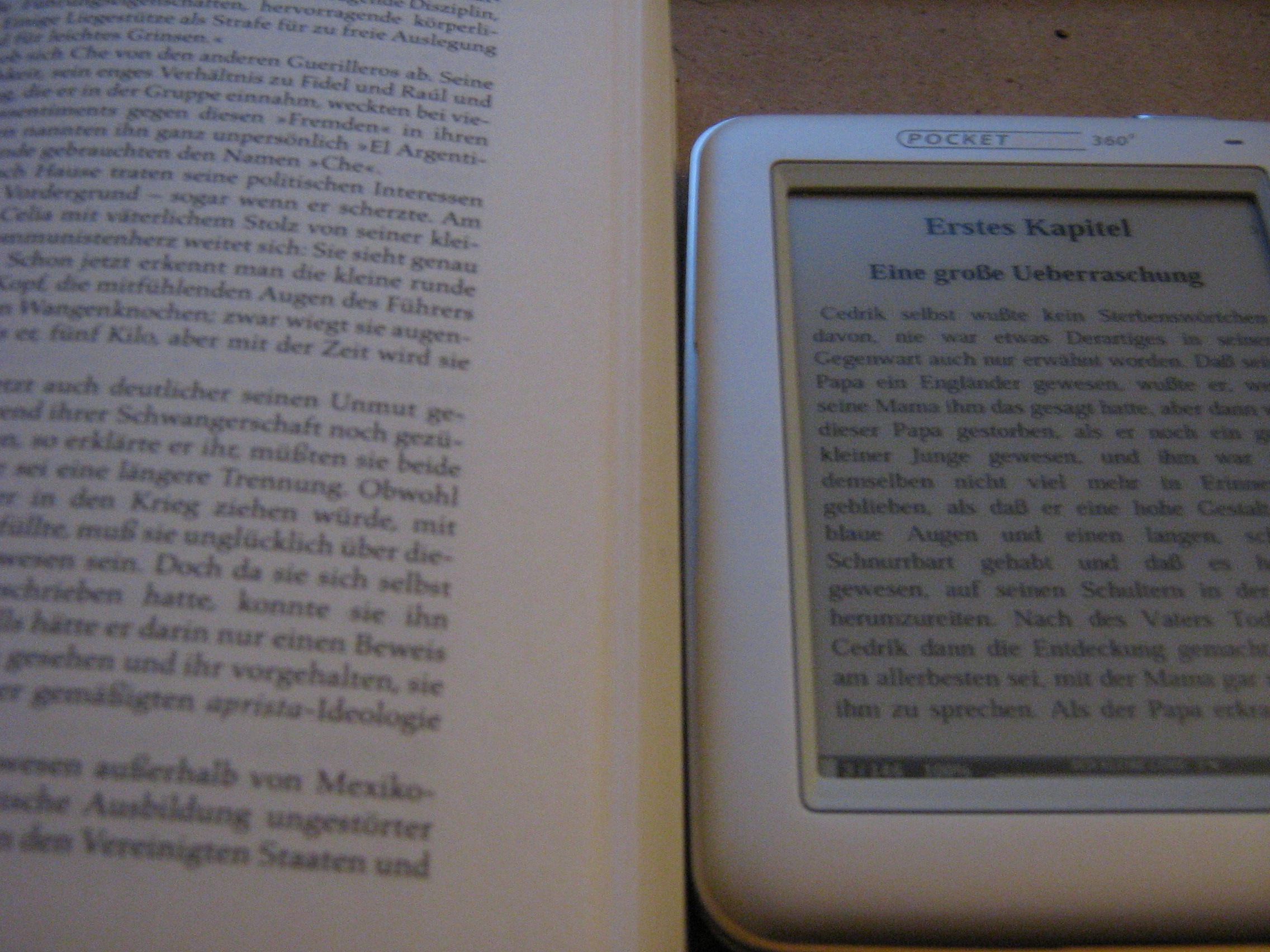 Ich habe mal zwei Bilder angehängt... links leicht zu erkennen ein normales Buch, rechts das PB. Einmal mit Blitz, einmal ohne. Das Problem ist: Klar, bei hellem Licht liest sich das PB gut genug. Aber in schummrigem Licht ist der Kontrast für meinen Geschmack zu niedrig. Und jetzt gerade im Winter wäre es ja angebracht, in weniger heller Umgebung zu lesen. Aber wie gesagt: Es dürfte eher an der Technik selbst liegen und nicht an diesem speziellen Reader. |