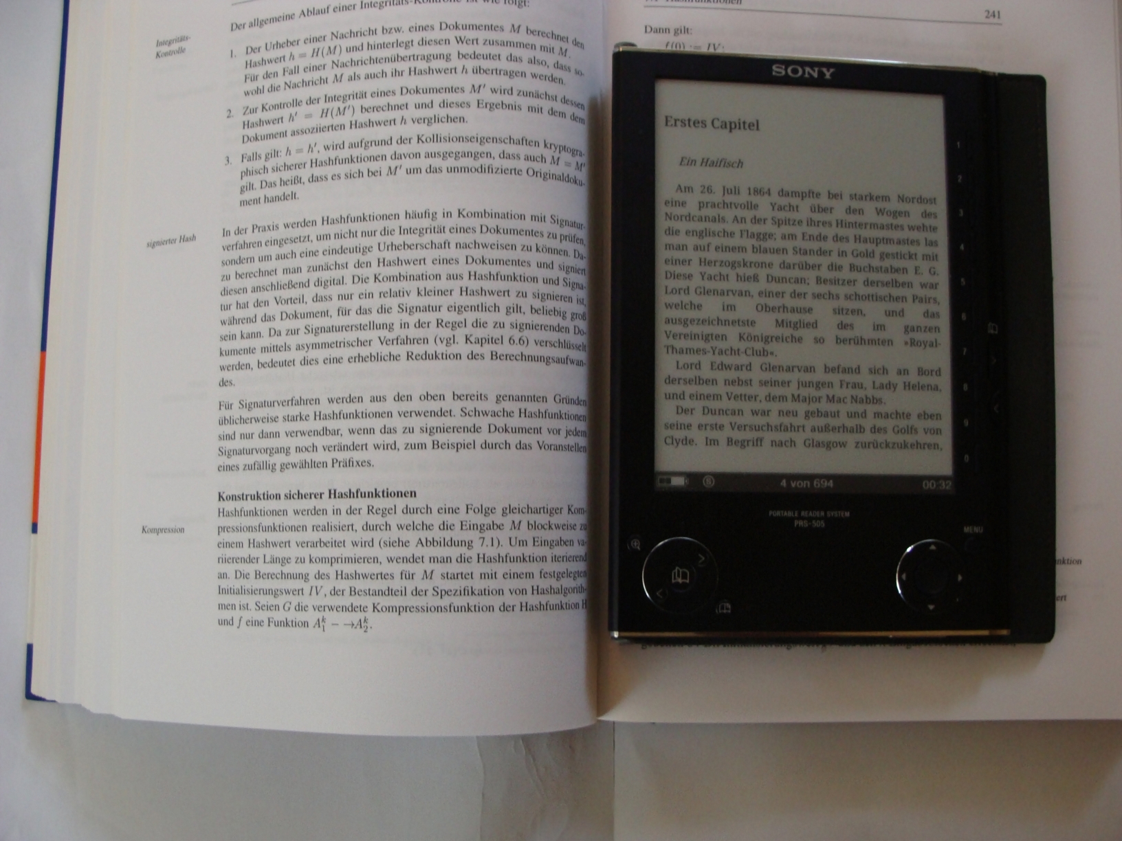 Anbei zum Vergleich mal ein paar Bilder a) Fachbuch mit Glanzseiten vs. RS-505 sowie b) Roman mit Faserseiten vs. PRS-505.