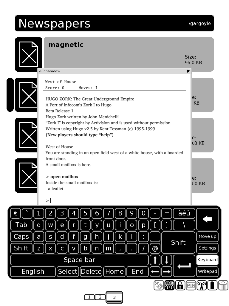 I've only had my iLiad for a couple of days and I don't really know what "unbricking" and so on means. I'm a programmer, I'm familiar with Unix and GNU/Linux and I've used Gargoyle a lot on my main Debian machine, but my iLiad is still set to the factory defaults; I haven't got any apps installed. I have a lot of IF I want to read, starting with Spider and Web which is in z-machine format. http://www.eblong.com/zarf/if.html I'm thankful for any advice and pointers! |