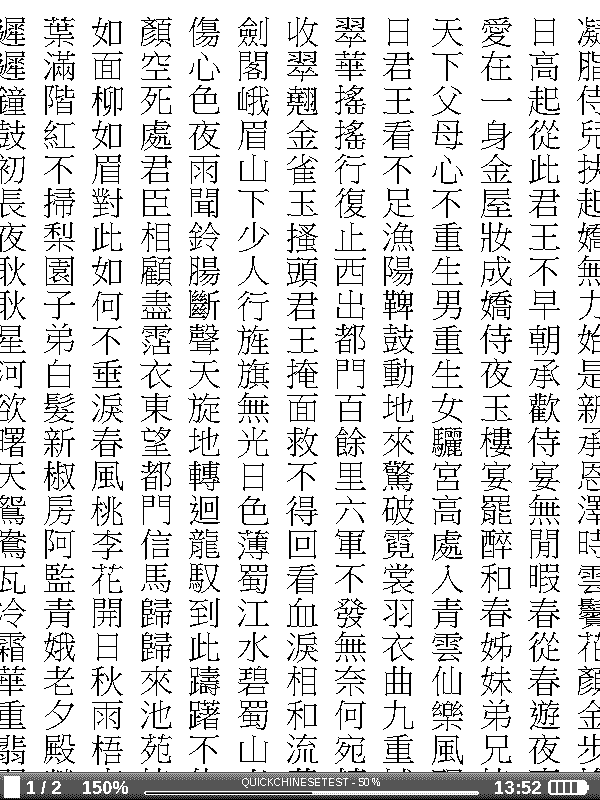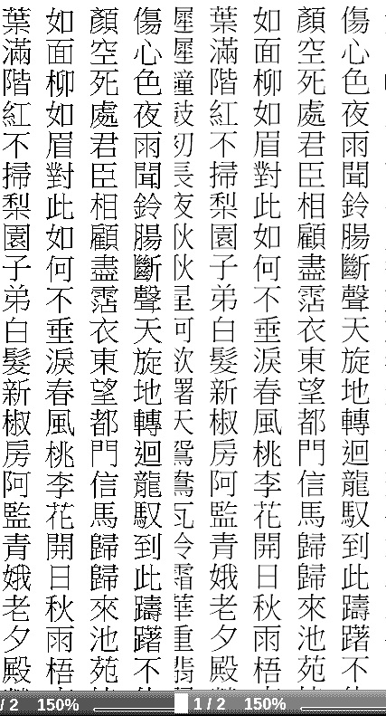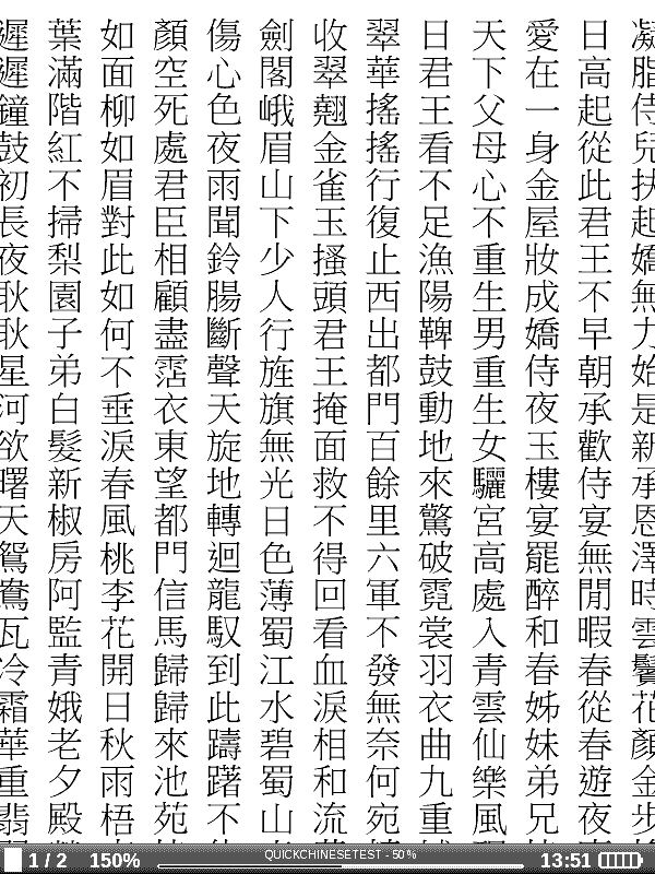 I'm not sure what size screen the PB360 has precisely, so I threw together a 100mm x 75mm PDF with a typical Chinese "book" serif typeface (新細明體), which displays quite poorly with very low contrast on the PRS-505. It's just a font test basically. Was wondering if anyone who has a PB360 could load this up and take a closeup snap with and without font anti-aliasing? You'd need to shoot macro to get close enough to photograph the difference effectively, but it'd be a big help to me. Thanks in advance if anyone can oblige.