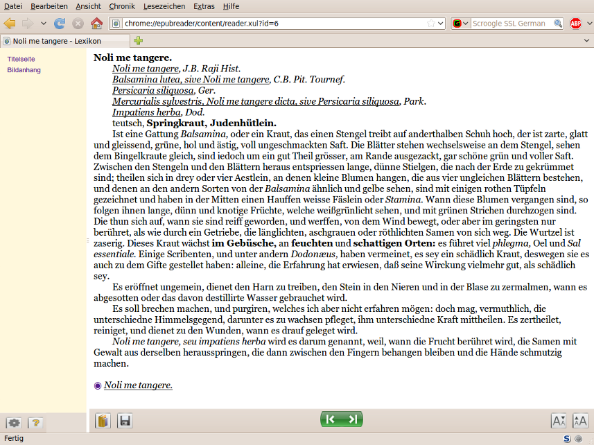 Ich habe jetzt noch mal zwei Screenshots angehängt, die Seiten von EPUB-Dateien zeigen, die mit der Digitalen Bibliothek 5 erzeugt worden sind; dargestellt mit dem EPUB-Addon für den Firefox-Browser. Last edited by Almandin; 12-11-2009 at 08:26 AM. |