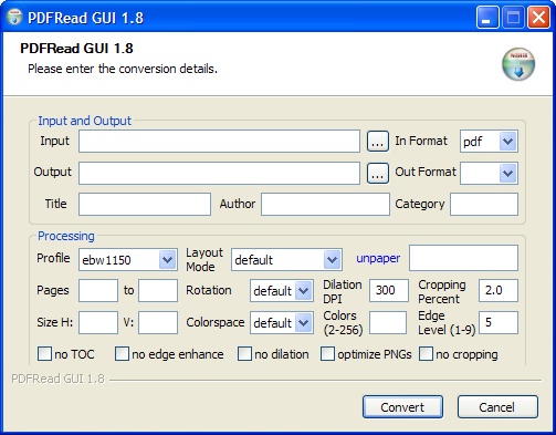 After struggling with various formats on my Hanlin V3 and especially with PDF files, I decided to give PDFRead a try. While there is no profile for the Hanlin V3 I used the Sony 500-l profile and used the resulting png images in the temp folder to see how the result would be.... WOW.. How usefull!!! this makes PDF files previously impossible to read on a small screen a bless. However... since the output of PDF read is limited to some closed formats not supported by the Hanlin V3 I took a look at some alternatives. using the loose PNG files only is not an option as a lot of reference PDF's I use output too much files, and I like having a good overview of my folders ![]() So I decided to take a look at some PNG to PDF converters. I found one working quite well, but for bigger files with hundreds of PNG images the resulting PDF gets corrupt. However, the smaller ones I did manage to creates give me good hope. Now, my question is.. since PDFRead converts from PDF and DJVU to PNG (and does a very good job in this!), will it be possible to get the option in to recreate the PNG files to PDF and/or DJVU? This way we have a true PDFRead program that converts PDF's to a format readible by Ebook readers with the advantage that PDF en DJVU files are read by a lot more readers then just the ones in the profile making the PDFRead program truely generic and usefull (at least for me )