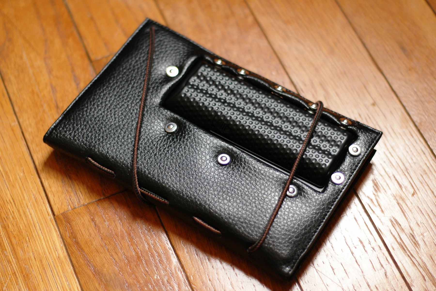 I modified a Leather Buisness Card holder purchased from staples fo $12. It is leather and is made by Staples. I could not find it on the Staples web site. I just happened upon it in the store.