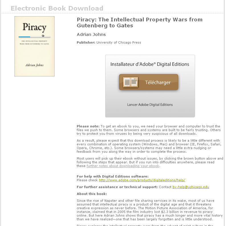 which takes me to this page : i click on the giant adobe button (which is a flash animation, so no way to right click / save as). ADE opens, then firefox (or chrome, or ie, or opera...) tries to load a new page, and i get this error : in other words, i get an error instead of / before downloading the acsm file. never mind. a kind soul has provided me with the book, and i am just going to write off the University of Chicago as a bad job. i'm tempted to send them a little email pointing out the irony of their use of drm resulting in my "piracy" of a book about piracy, but i'm not sure i feel like expending any more energy on the question. me too, and me too. gaa, whatever, University of Chicago ! i'm officially giving up now. |