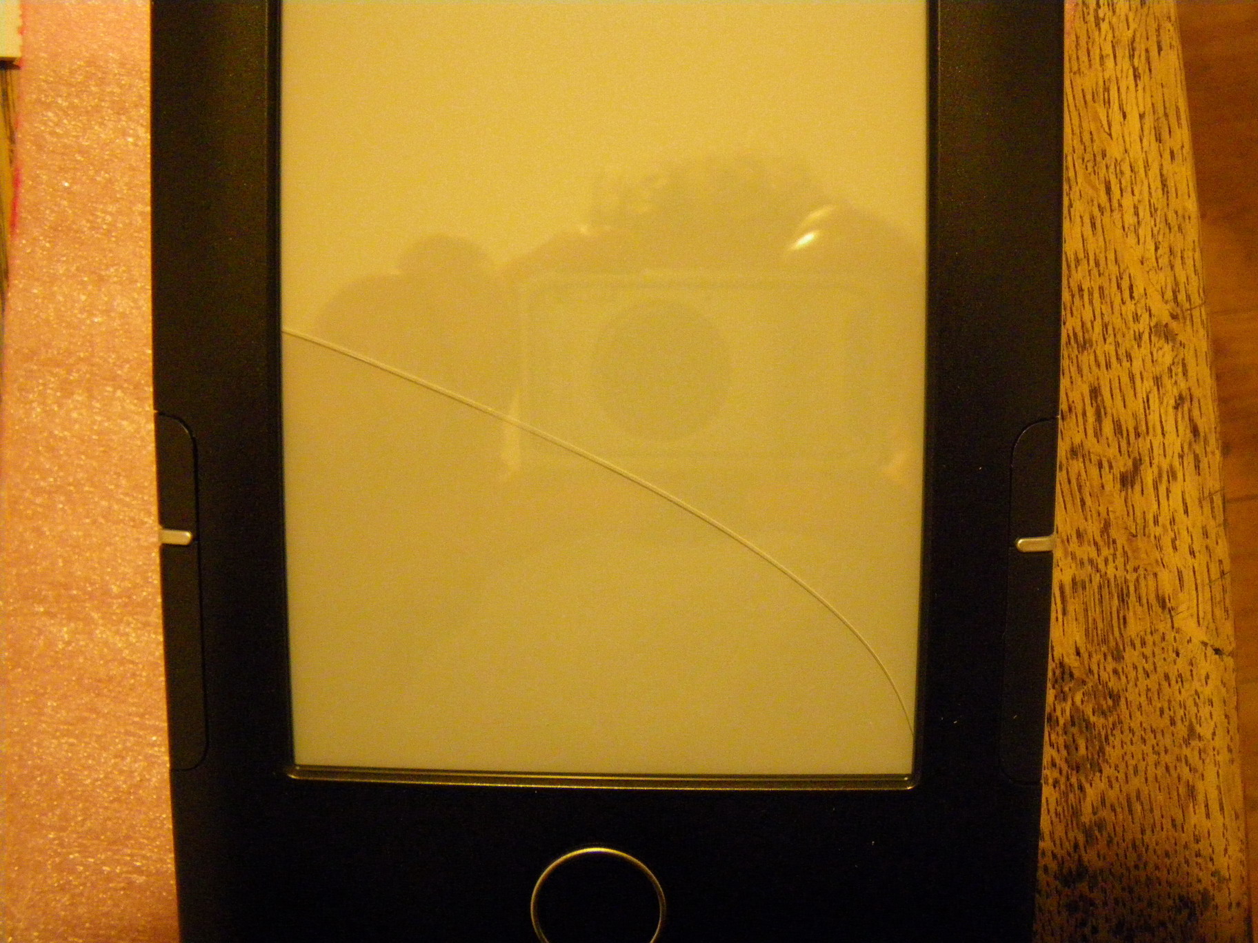 Sieht so aus, als wenn der Glaslayer zwischen Touchscreen und E-Ink gebrochen/gerissen ist. Könnnte ein Spannungsriss sein. Mit dem Verkäufer in Verbindung setzen, einpacken und wieder zurücksenden...