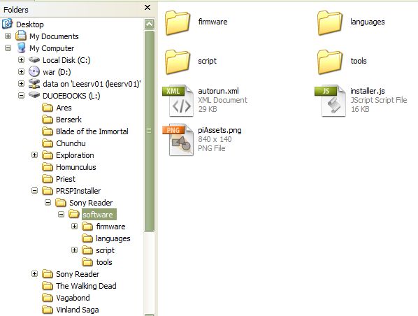 It means that it couldn't find the file (or one of the required files) on sd card: "/PRSPInstaller/Sony Reader/software/autorun.xml" (or file was damaged) Sorry, I forgot to mention, it could only be used to start it from SD card. If you want to start it from MS card edit the following line: kbook.autoRunRoot.path = "b:/PRSPInstaller/Sony Reader/software/autorun.xml"; and replace b:/ with a:/ Could you please post a screenshot of what you have in: "/PRSPInstaller/Sony Reader/software/" folder? PS You might need to reset the reader (if just connecting to PC won't help) to get rid of an invisible installer frame that wasn't fully loaded. Last edited by kartu; 03-08-2010 at 11:23 AM. |