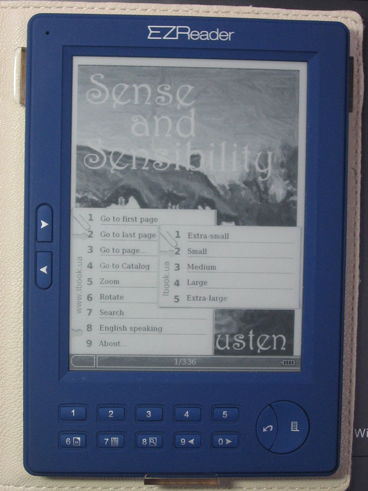 These aren't the best images, but I hope they will give you some idea of what the LBook firmware looks like: LBook Splash Screen: Bookshelf with Arial Font: Bookshelf pop-up menu: Settings menu: Bookshelf after setting system font to DejaVu Serif (installed in the /fonts folder on the SD card): CoolReader 3 main menu, page 1: CoolReader 3 settings, page 1: CoolReader settings, page 2 - Note #3 where "Document Embedded Styles" is turned off so I can use the css style sheets stored in the CRENGINE folder on the SD card: CoolReader keyboard layout - (long press of #1 in CoolReader - LBook version is much easier to read than the one from Astak): Dictionary look-up menu (quick-press of #3), which could be used with whatever dictionary is installed at the time. LBook firmware ships with an English-Russian dictionary, but this can be over-ridden by the properly formatted files installed in the /dict folder in the internal memory. The dictionary I installed needs to be edited as it tends to find forms of the target word, rather than the word itself. In this case it finds "god-forsaken" instead of "god": The is the other look-up which locates a word on the screen in a way similar to have some mobile phones lookup words for texting, also for looking up in the dictionary. In this case, it returns a screen that says it could not find "Mongoloid": CoolReader font-size change screen (key #8) - note that this is the second of two pages, with additional smaller choices on page 1: Pop-up menu for Epub and PDF viewer: Zoom options for Epub and PDF viewer - only 5 for LBook firmware, unlike 9 for Astak: File tools pop-up menu accessed by long-press of selection in the Bookshelf: Options popup for MOBI, PRC and possibly other formats (which don't include TTS): Font-size popup for MOBI, PRC, etc. Hope this helps! After doing all this, I realized I didn't photograph the pop-up for LIT and PDB files...sorry about that! It would have included the "English Speaking" option and is probably identical to the options on the Astak firmware. Cheers! |