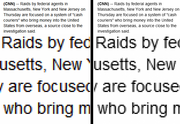 An oddity with many color screens is that black text is rendered not in grays alone but also using colors. If you do a screen capture on your PC or Mac of a page of text, then zoom in (don't rescale just zoom in) to a portion of that text in Photoshop you will see some random color pixels which really don't seem to belong. That can cause your eyes and brain to incorrectly interpolate the text and make it seem fuzzy. If you then convert the text image to grayscale it seems easier to read. Too bad reader apps made for color screens don't have a "render in true grayscale" option. Here is an example randomly captured from the CNN website and shown on top at 100% scale and at bottom at 400% scale. On the right you can see the colored pixels used to render a black text. This was captured from a PC LCD monitor so the iPad might look different. On the left the text was converted to grayscale mode. ... Last edited by jswinden; 05-13-2010 at 03:31 PM. |