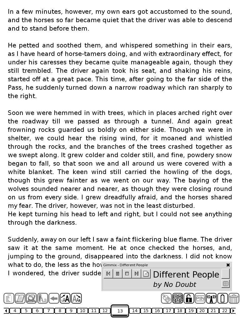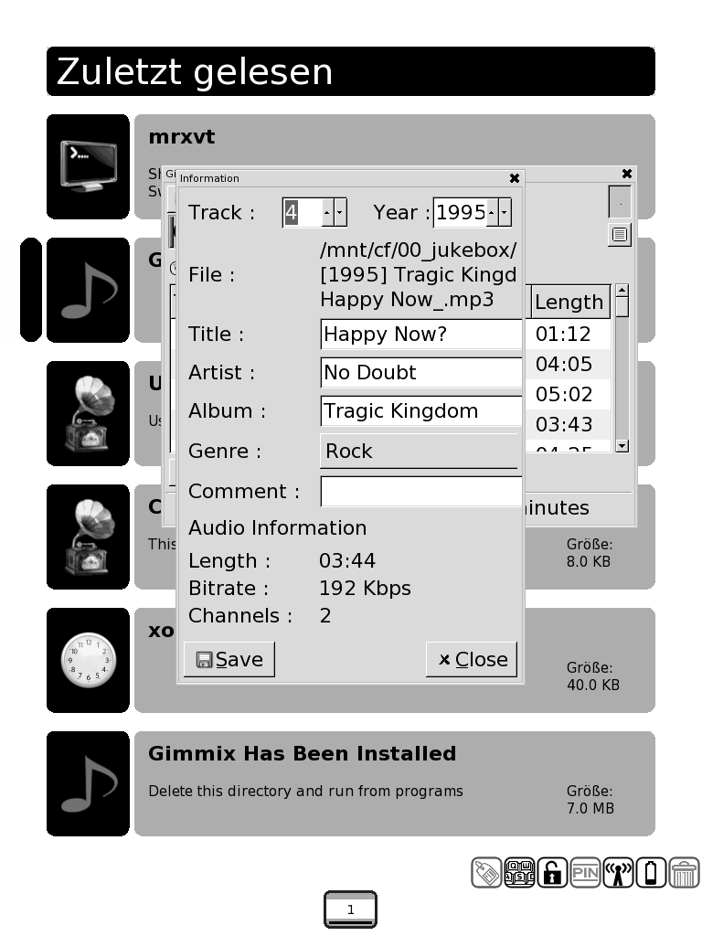 Hello to all who are interested in using iLiad as a music player. I can offer brand-new information about my current porting project. First a bit of history: It started all months ago. Adam B. ported the Music Player Daemon [mpd] & the command line client mpc. You find the thread here. I got a new toy [Yamp!]. I have added some shell scripts to make all features of mpd/mpc useable in iLiad's Contentlister. This is working, last update was uploaded some time ago. GUI is better than command line bundled with shell scripts in Contentlister: My current jukebox 2.x is working, but it could be better, of course. # mpd is compatible to more formats like mpc or flac. Hey, this is geeky, a lossless format on iLiad. It is working on my iLiad. # The next great step is replacement of the command line client mpc with a Graphical User Interface [GUI] client. I have chosen Gimmix. It is "working", problems are described below. Screenshots are attached. # I wanna have full access to music library during running ipdf/mobipocket/fbreader fake FAQ: [never asked, but could be asked; I decide what FAQ is and what not. ]Q: We have mpd & mpc. Why change a winning horse? A: Switching from command line to GUI is a evolutional step. W/o evolution we wouldn't get progress. Q: Can Gimmix playback xvid, divx files, control my coffee cooking machine, calculate next week lottery's numbers, or enable iLiad's top secret colour mode? A: No & never will. Q: That's bad. Why? A: Your car isn't a rocket plane. Q: Hey yokos, do you own a mp3 player? A: Yes, an iLiad. My old Sony MZ-R50 [a MD Walkman] doesn't count. Q: Can I control music [switching song etc] during reading a pdf? A: Yep, isn't this cool? This was not possible with command line/Contenlister. current status/problems of project: Gimmix is running on my iLiad. This is much more sexy than these entries in Contentlister. ![]() ![]() Problems [-> therefore not published yet, but it will be soon, hopefully not iRex' "soon"]: # 4 icons in Gimmix are missing [very odd] [information, volume control, shuffle, repeat] -> error message of run.sh below gives a first clue # right-button click of stylus would be cool, because Gimmix has got [right button] Clicking in dialogs # window of Preferences dialog is too small Solved # The font of artist/track title is too big. # The names of playlists generated by mpd are not userfriendly: like genre.100. Solved # Refreshing screen as always [not a real problem] run.sh 2> run.error.txt: Code: